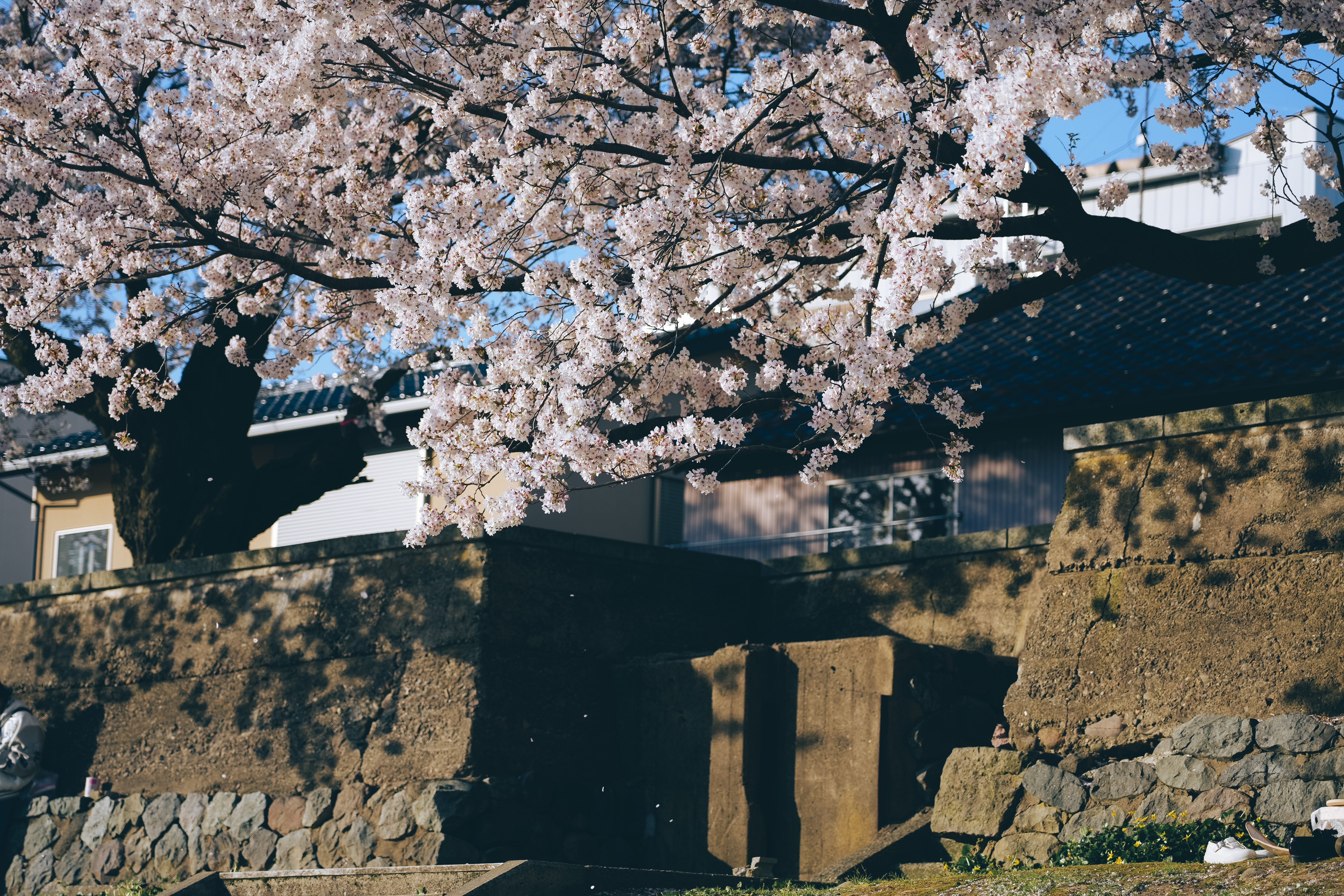 古い石塀と瓦屋根の建物を背景に、満開の桜が咲き誇る春の風景の写真素材です。白くぼんぼりのような花をつけた桜の枝が石塀の上に垂れ下がり、濃い色の枝と青空とのコントラストが鮮烈で、背景には日本家屋の古い建造物が見えています。春の季節素材や庭園の風景、和風デザイン、観光地紹介などにおすすめです。