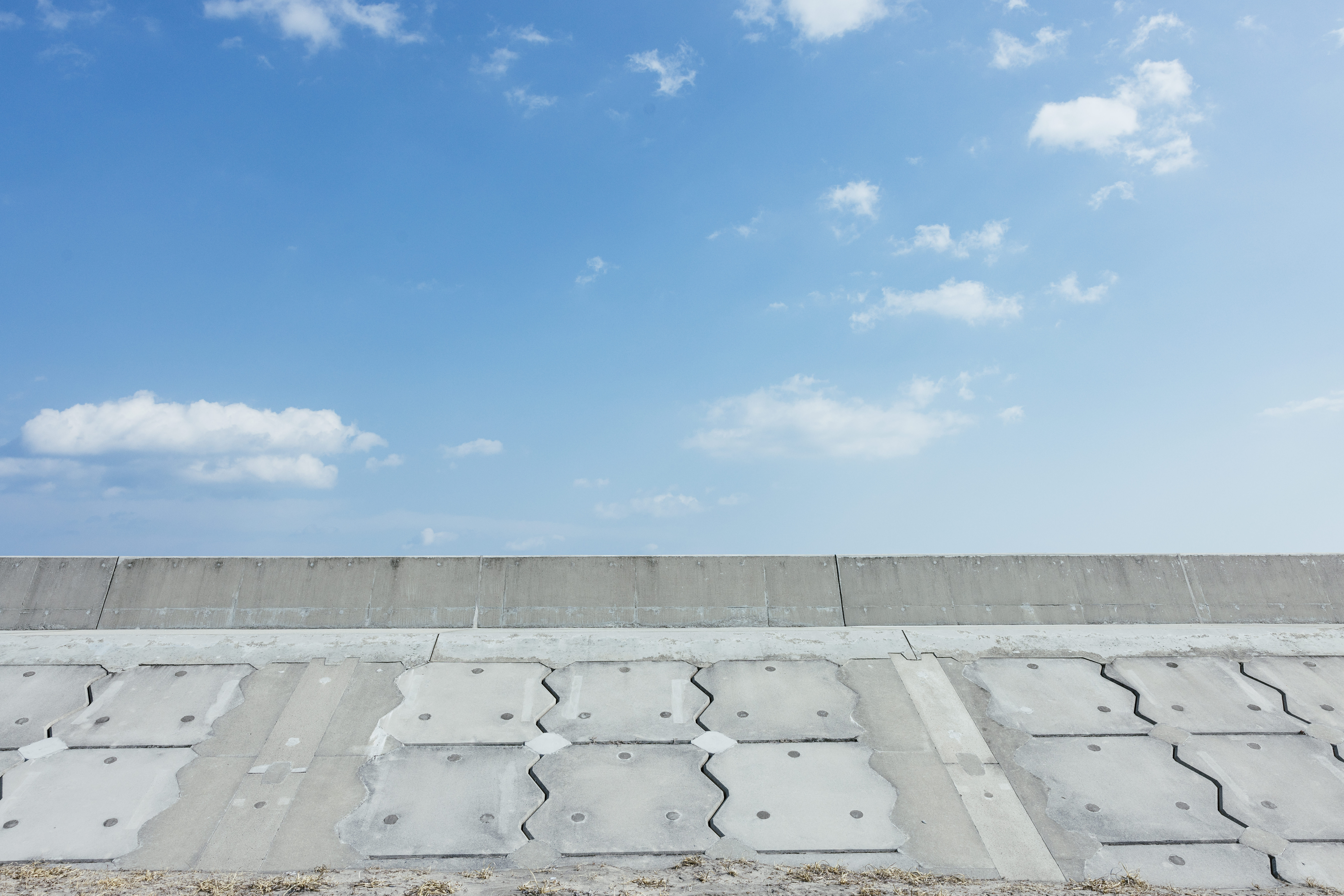 南相馬の海岸防波堤の写真素材です。福島県浜通りの海岸に広がるコンクリート製の白い堤防が横に長く連なり、規則正しく並んだ継ぎ目が見られます。快晴の空に白い雲が浮かぶ風景で、防災関連やインフラ、地方創生、海岸風景などのコンテンツに活用できます。