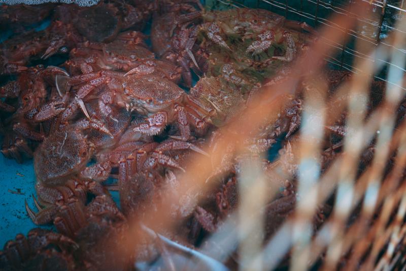 小名浜港で販売されている毛ガニの写真素材です。青い水槽の中に赤茶色の毛ガニが複数匹入れられ、細い足や爪をそろえた状態で活きたまま並んでいます。福島県いわき市の漁港で取れた新鮮な甲殻類の販売風景を記録した一枚で、グルメ関連コンテンツや旅行情報、食材紹介などにおすすめです。