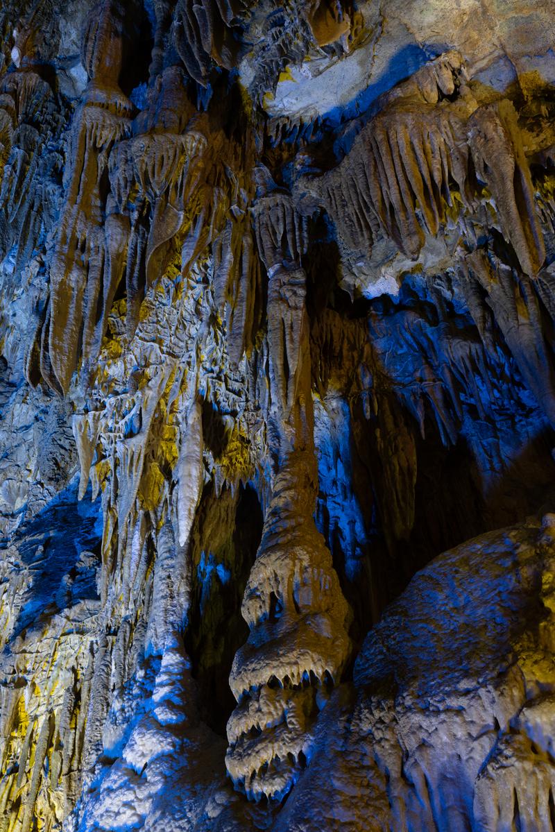 あぶくま洞の鍾乳石を薄明ライトで照らした写真素材です。天井から垂れ下がる黄土色や白灰色の鍾乳石が複数並び、青白いライトが当たった部分と暗い陰の部分が交互に浮かび上がり、石筍も床に立ち上がっています。観光地の紹介やWebサイト、ブログ、旅行関連コンテンツなどにおすすめです。