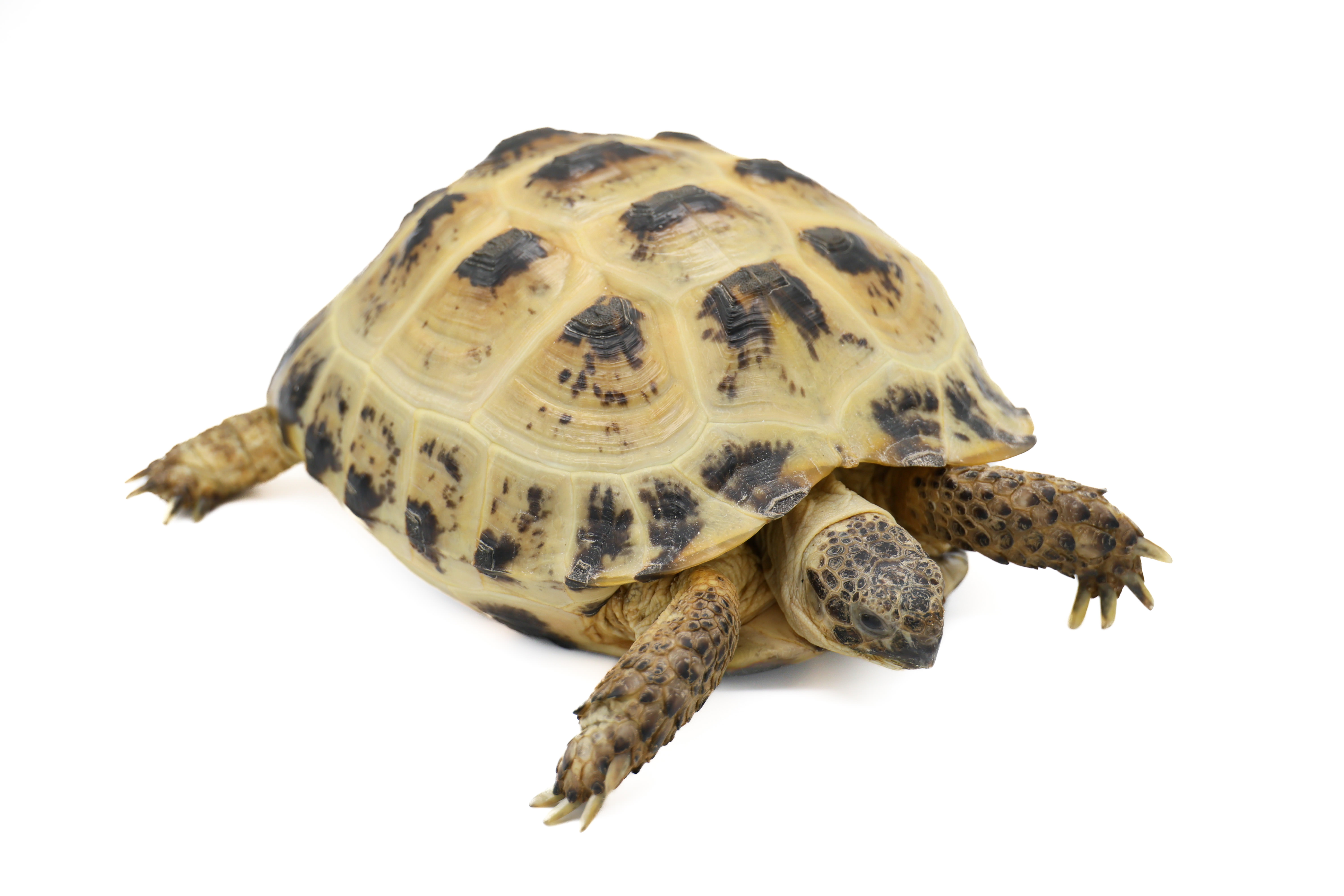 ロシアリクガメが白背景の上を歩く写真素材です。黄色地に黒い斑紋が入った甲羅を持ち、ゴツゴツした四肢でゆっくり進む姿が捉えられています。爬虫類関連のコンテンツやペット情報、動物図鑑などにおすすめです。