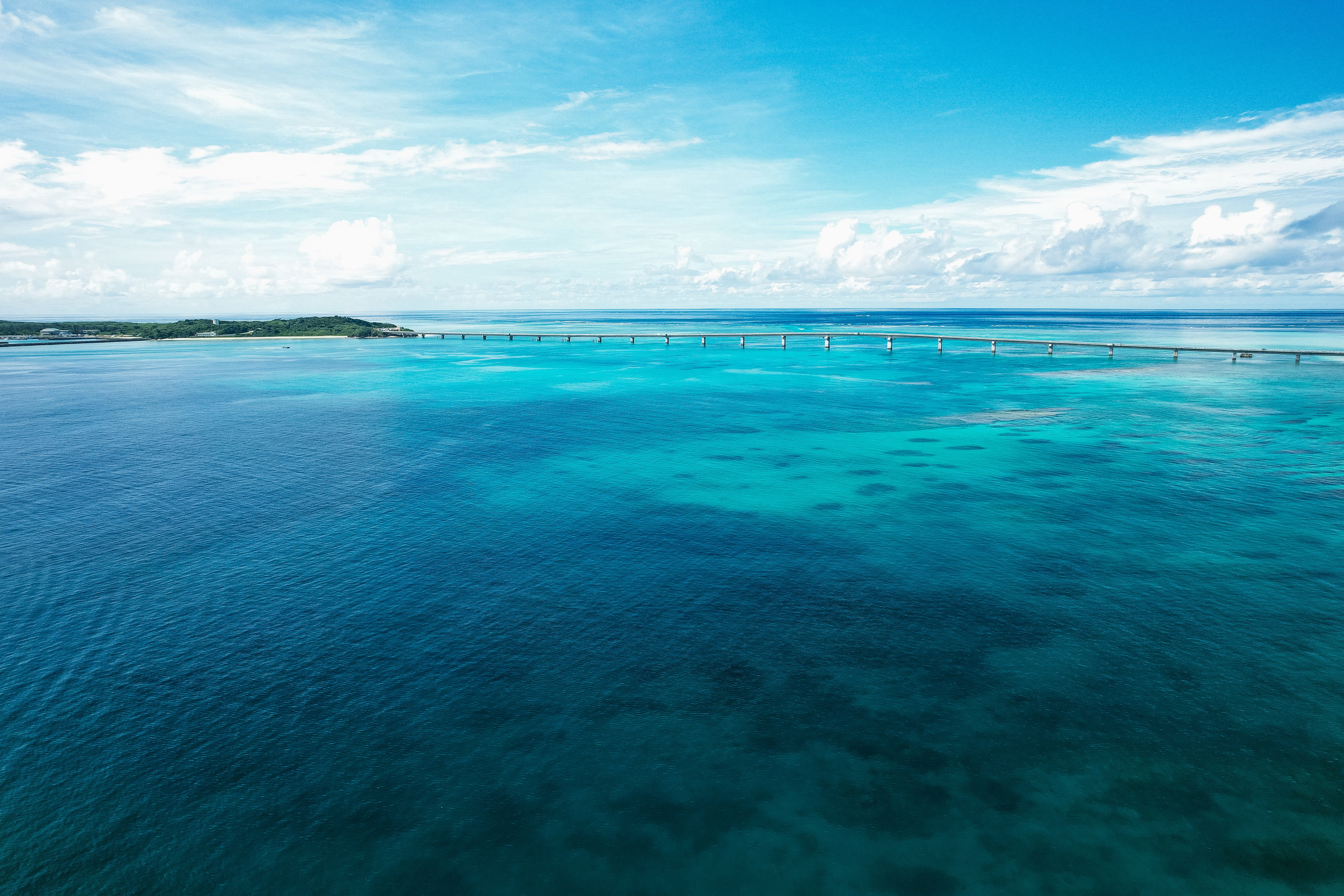 宮古島の海を横断する伊良部大橋の写真素材です。青い海の上に長く延びた白い橋が中央奥へ消え、橋の向こう側には緑の島が見え、上空には白い雲が浮かぶ快晴の空が広がっています。観光地やリゾート地の紹介、沖縄関連のウェブサイトやパンフレット制作などにおすすめです。