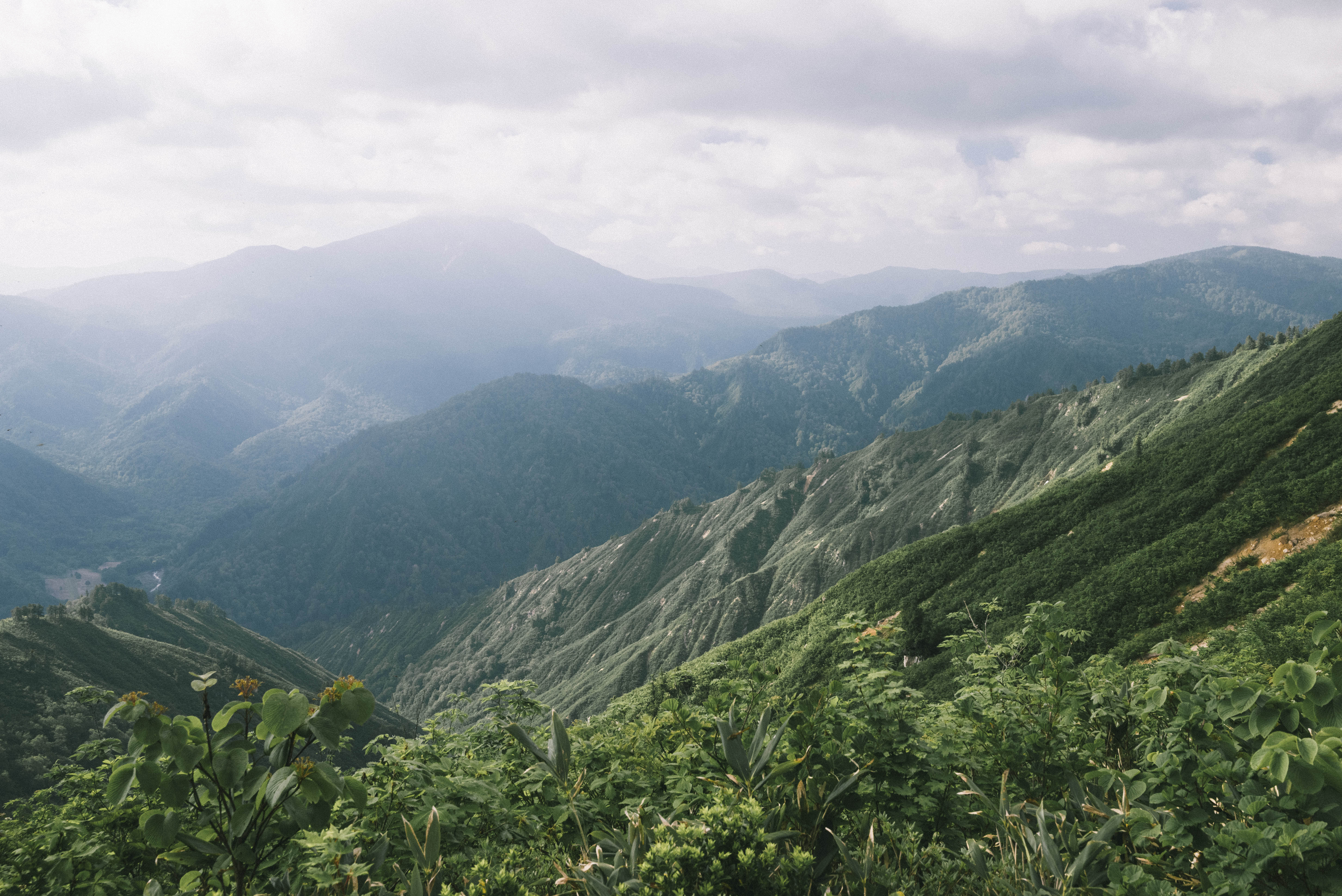 山深い南会津の日本百名山・平ヶ岳周辺の山々の写真素材です。手前には高山植物が群生し、奥には複数の山峰が重なり、左手の沢には清流が流れています。福島県の標高2141mの平ヶ岳を中心とした山岳景観は、季節素材や登山ガイド、旅行ブログ、観光プロモーションなどにおすすめです。