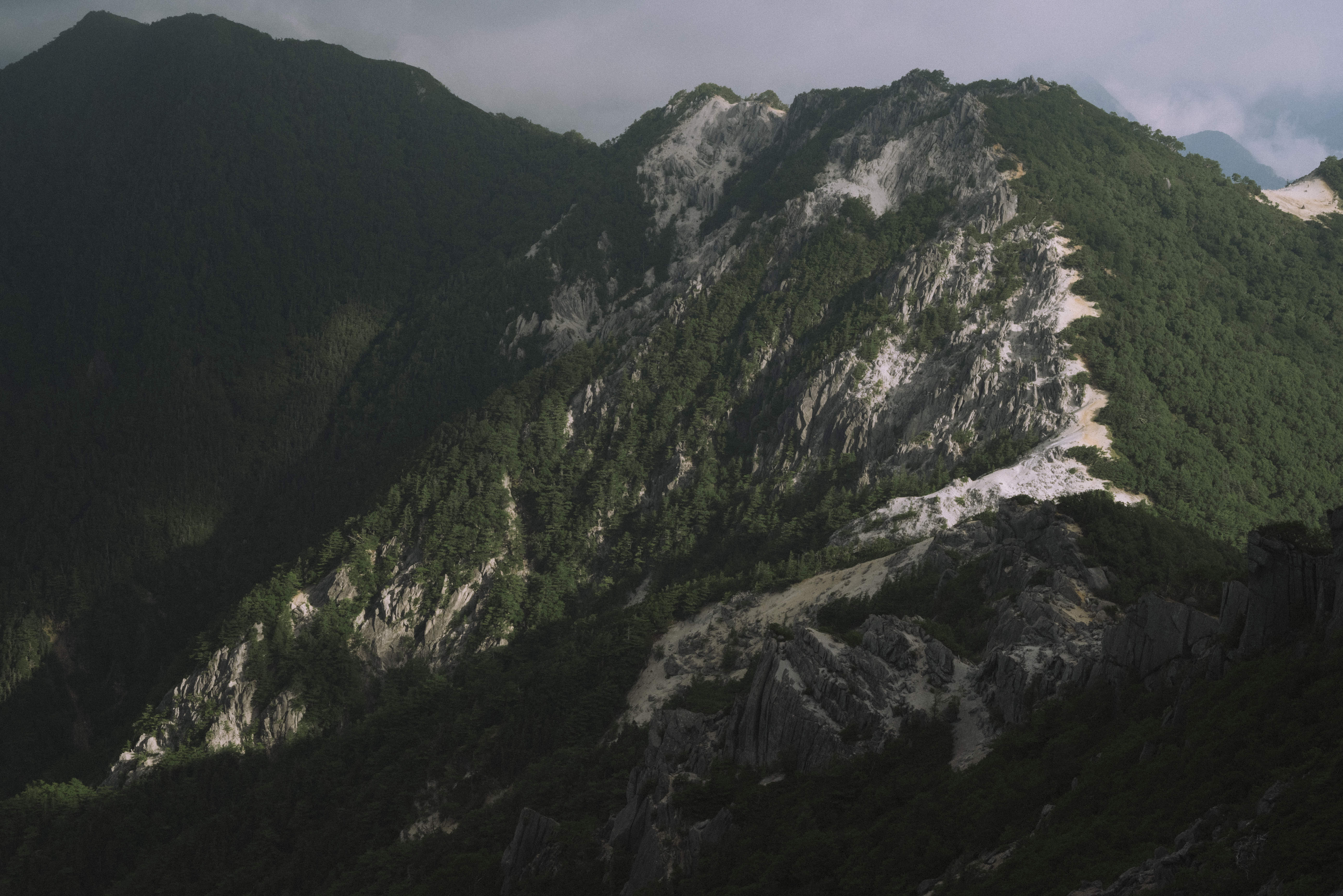 鳳凰三山の山肌に広がる露岩帯と針葉樹林の写真素材です。曇天の空の下、急峻な斜面に灰白色の岩肌が複数箇所に露出し、針葉樹の緑と対比をなしている。南アルプスの山岳記事やトレッキングガイド、登山ブログなどにおすすめです。