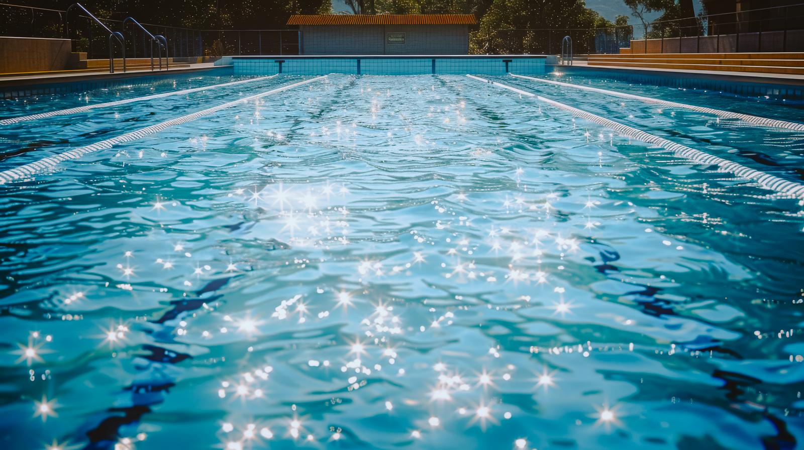 AIで生成した屋外プールの画像素材です。青く澄んだ水面全体に白い光が無数に反射し、コース内には黒いラインが引かれており、両側には手すりとレーンロープが設置されています。スポーツ施設の紹介やウェルネス関連のデザイン、リゾート施設のプロモーション素材として活用できます。