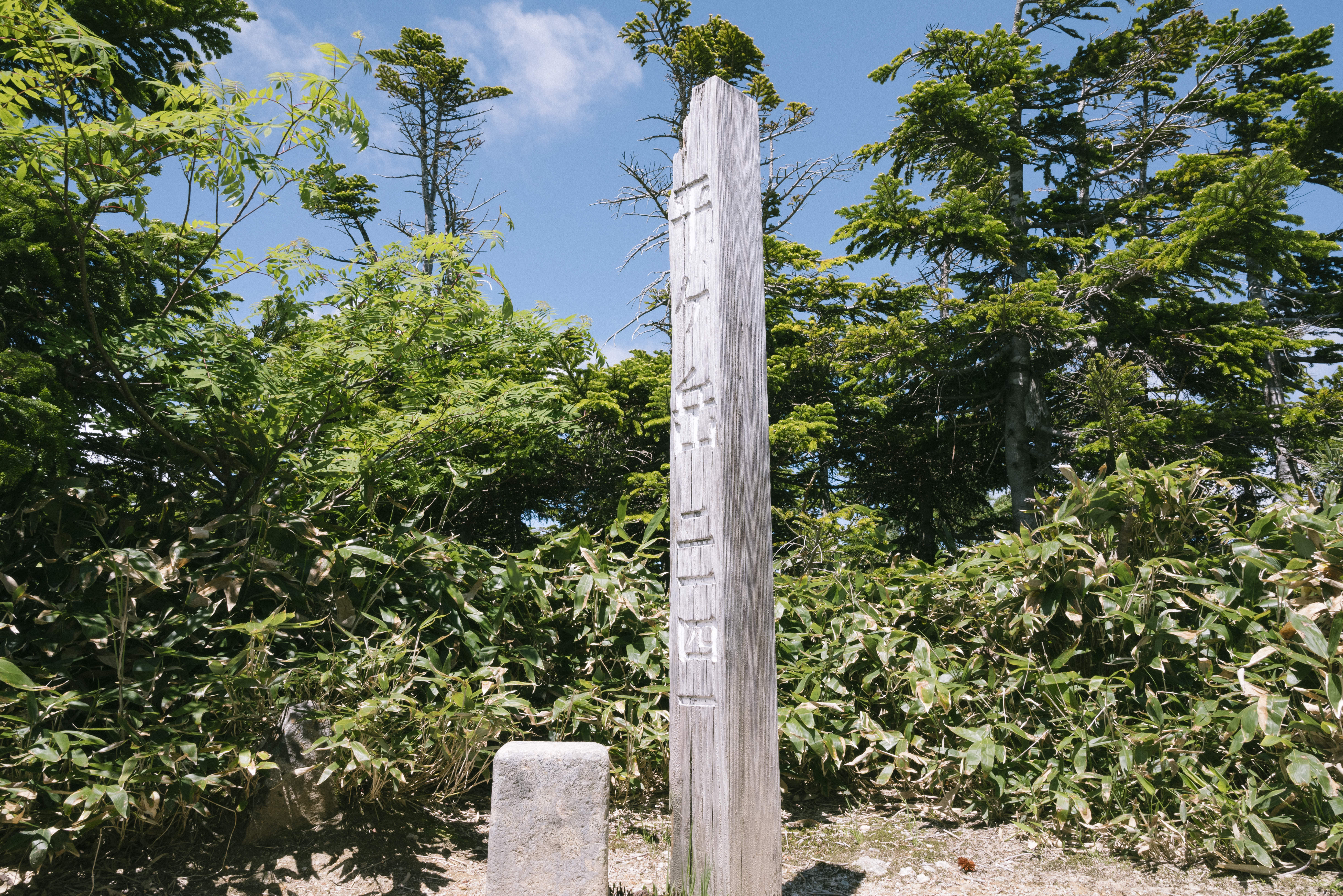 日本百名山の平ヶ岳山頂の写真素材です。樹林帯に立つ白く塗装された木製の山頂標と、周囲に密集する濃い緑の低木が見られ、眺望に乏しい樹林帯での登山の様子を表現しています。登山やトレッキング、日本の山岳地帯の紹介、観光・旅行コンテンツなどにおすすめです。