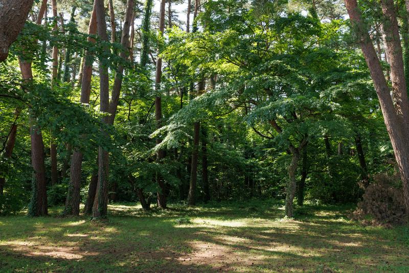 夏の雑木林で木漏れ日が地面に斑点を作っている写真素材です。針葉樹と広葉樹が混ざって立ち、横に大きく枝を広げた木が中央に写っている。自然風景やアウトドア関連のコンテンツにおすすめです。