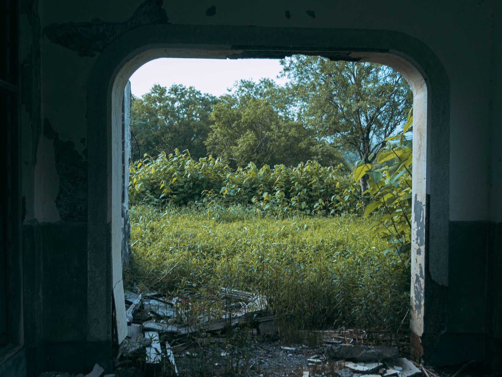 廃墟の窓枠を通して見た茂みの写真素材です。コンクリートで劣化した窓の向こうに、背丈ほどの雑草が生い茂り、奥には樹木が立ち並んでいます。自然に還る風景や廃墟の記録、歴史的建造物の素材として活用できます。