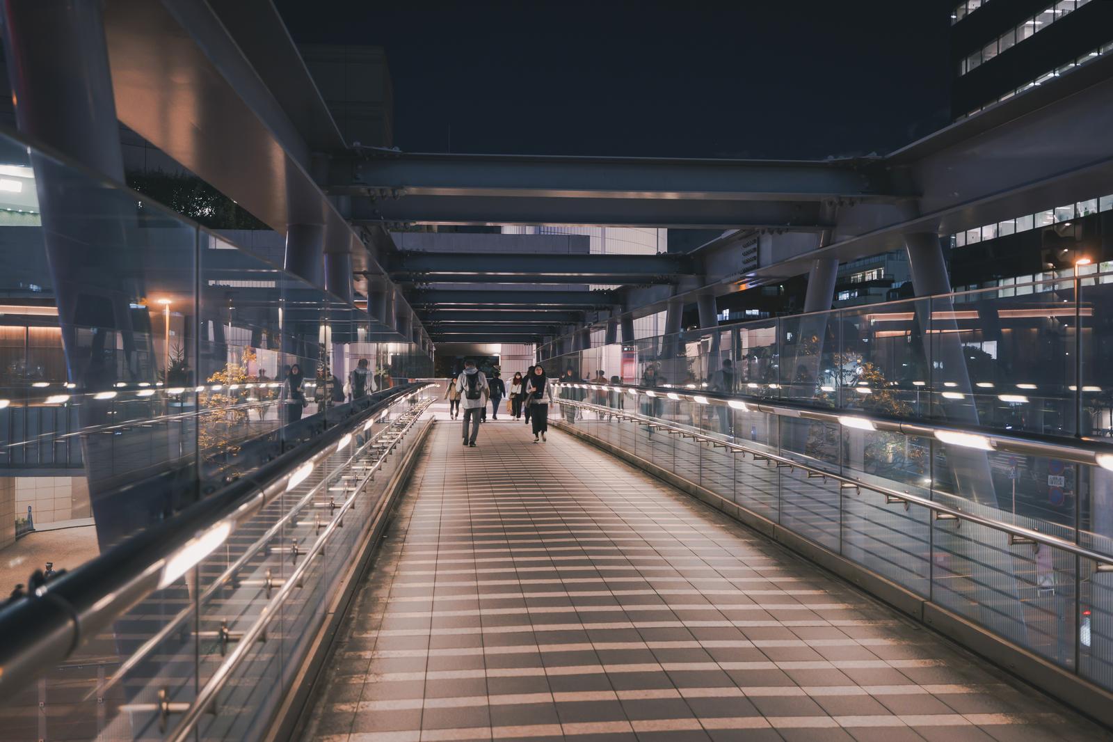 ブリッジ渋谷21の通路を歩く人々の写真素材です。天井付きの広い通路の両側にはビルが立ち並び、照明で照らされた白いタイル張りの床と金属製の手すりが見え、複数の人物が行き交っています。聖地巡礼や渋谷の都市風景、夜間の街並みコンテンツなどにおすすめです。