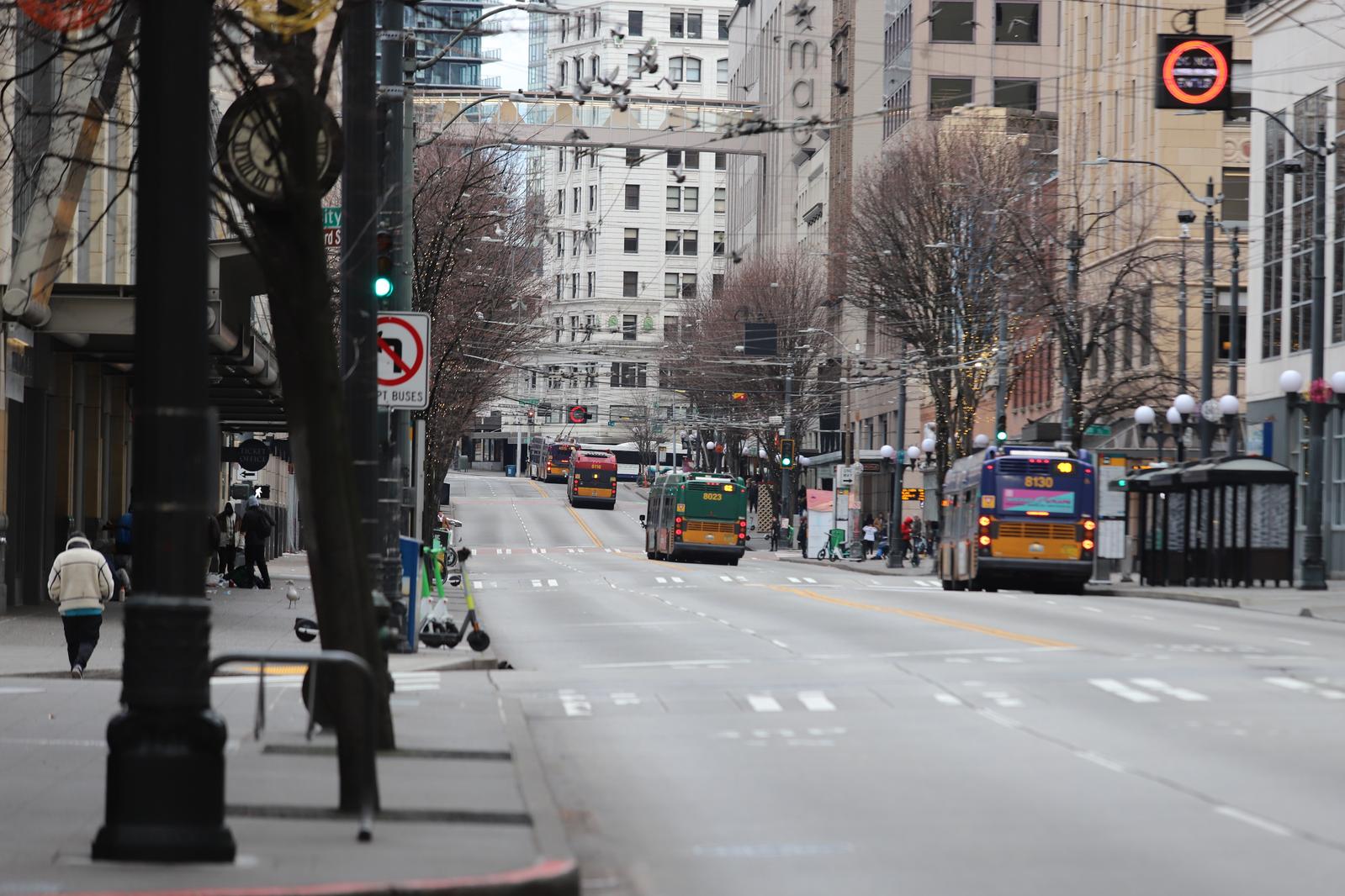 Buses Lined Up on a City Street in Seattle