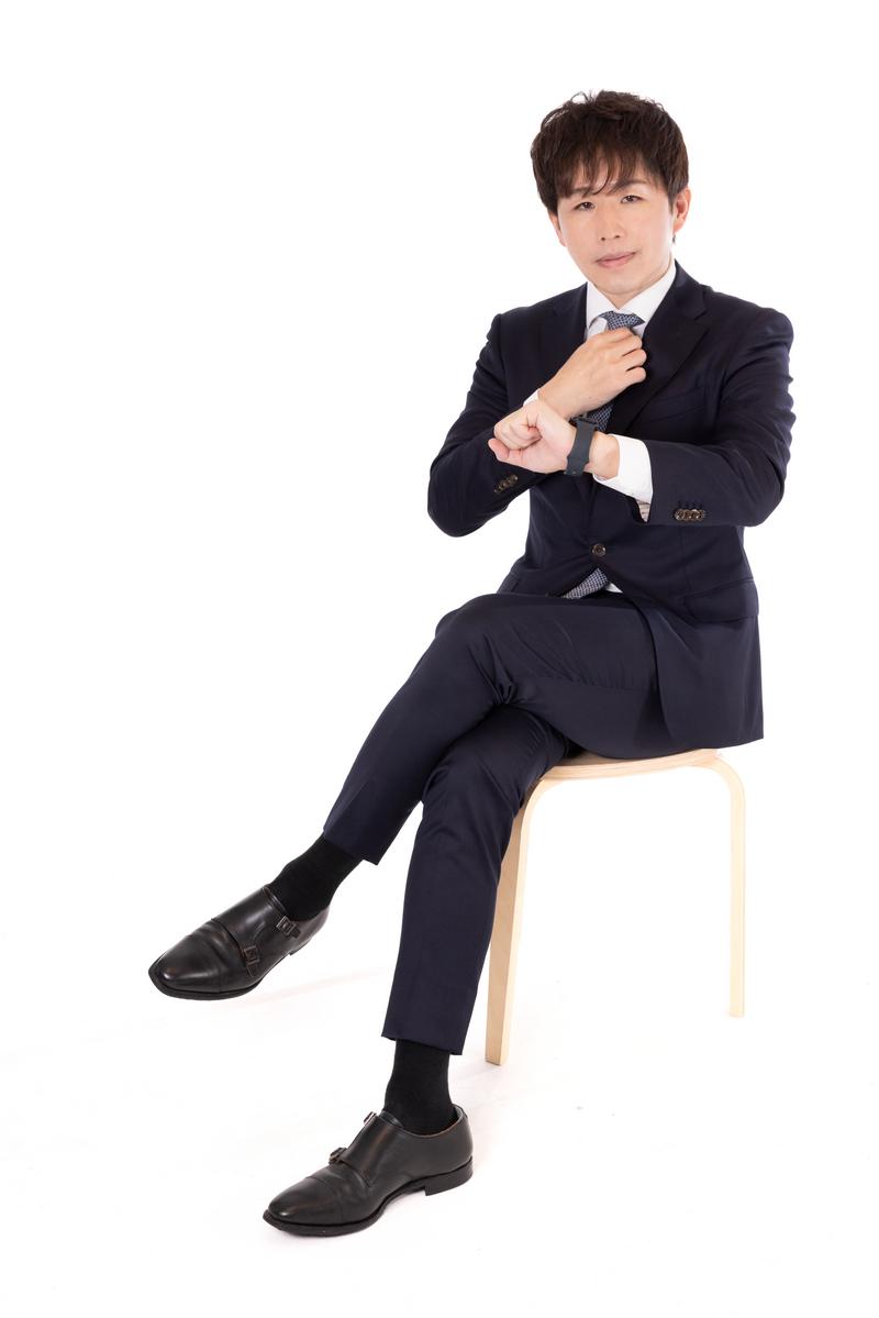 M&Aアドバイザーの男性会社員の写真素材です。紺色のスーツに白いワイシャツとネクタイを着用した男性が、木製の椅子に腰かけてネクタイを整えながら前を向いています。企業研修資料、採用サイト、ビジネス関連のWebコンテンツやブログなどにおすすめです。