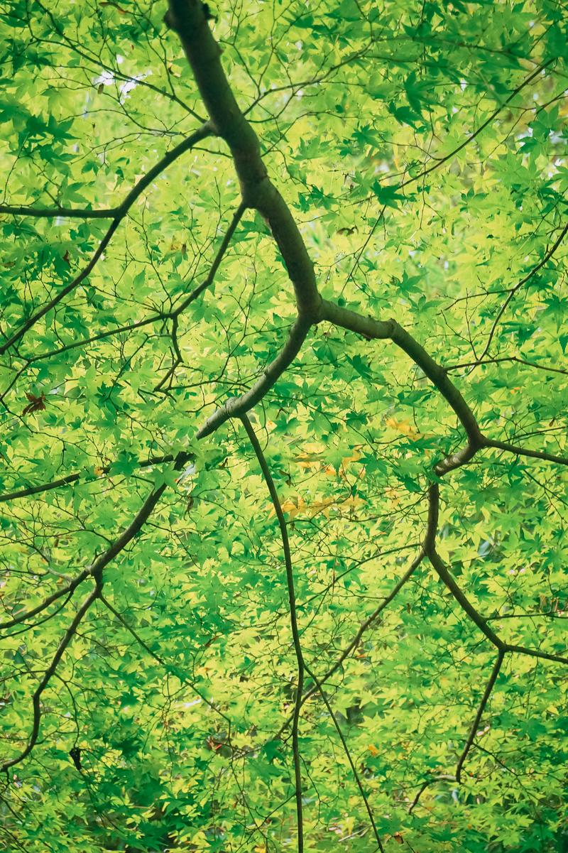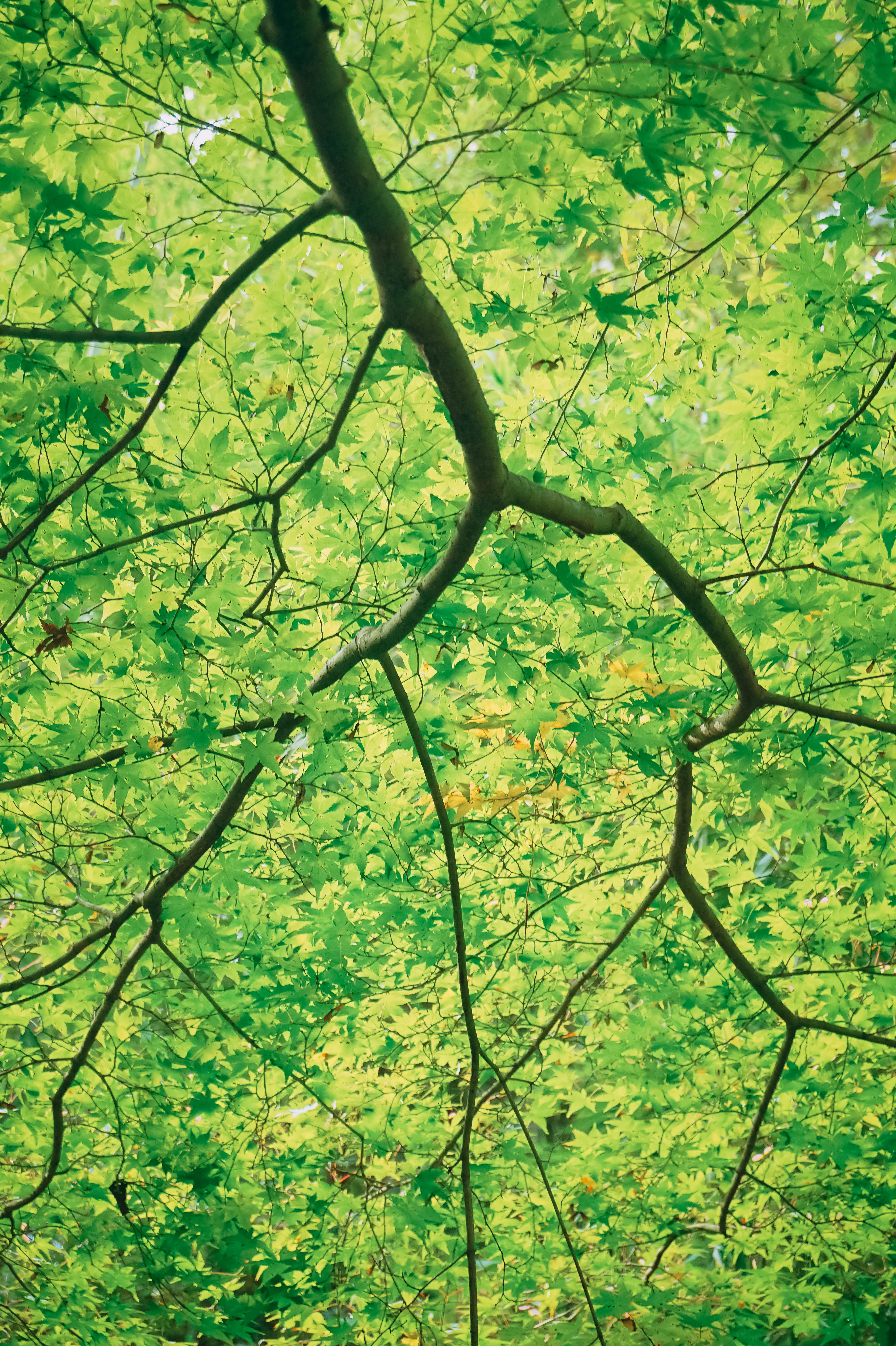 青もみじが茂る木の枝を下から見上げた写真素材です。太い幹から分岐する複数の枝が放射状に広がり、その先に黄緑色から濃い緑色の細かい葉が密集して付いており、隙間から白い光が差し込んでいます。季節素材や自然・森林関連のウェブサイト制作、緑化関連のコンテンツなどにおすすめです。