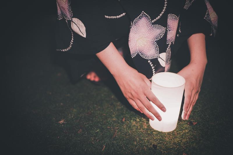 奈良の燈花会で浴衣を着た女性が灯籠に灯をともす写真素材です。ピンク色の麻の葉模様が入った浴衣姿の女性が両手で白い灯籠を持ち、灯籠の周囲には小さな白い玉の装飾が複数下がっています。夏祭りや奈良観光、風情ある日本文化の表現に最適です。
