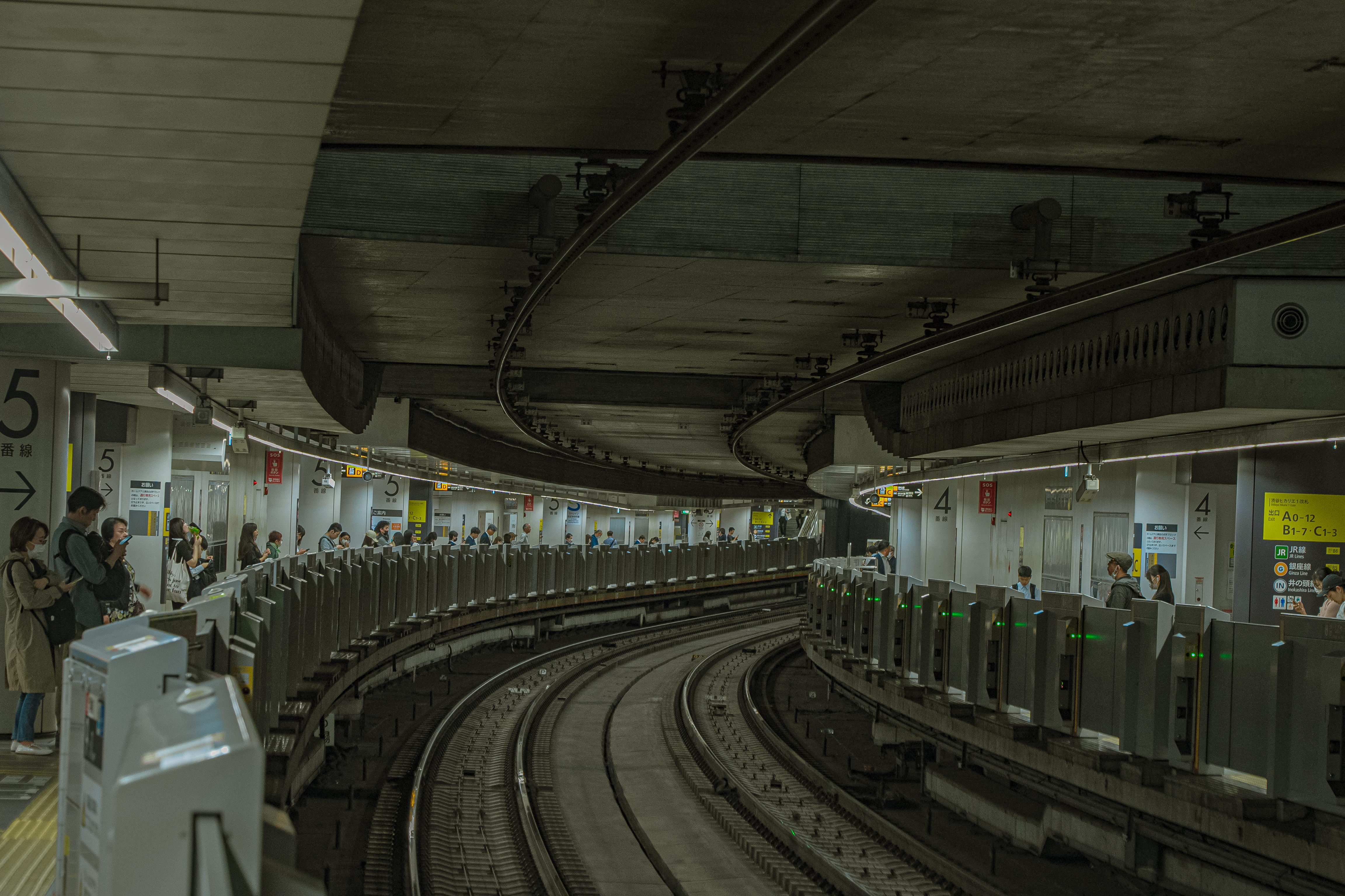 東京メトロ副都心線渋谷駅のホームと線路の写真素材です。曲線を描く複数本のレールが駅の奥へ続き、階段番号表示や駅設備が配置されています。副都心線の鉄道インフラを実際に撮影した素材で、多くの乗客がホームに立ち、駅舎や公共交通関連のコンテンツ、建築・インフラ紹介などにおすすめです。