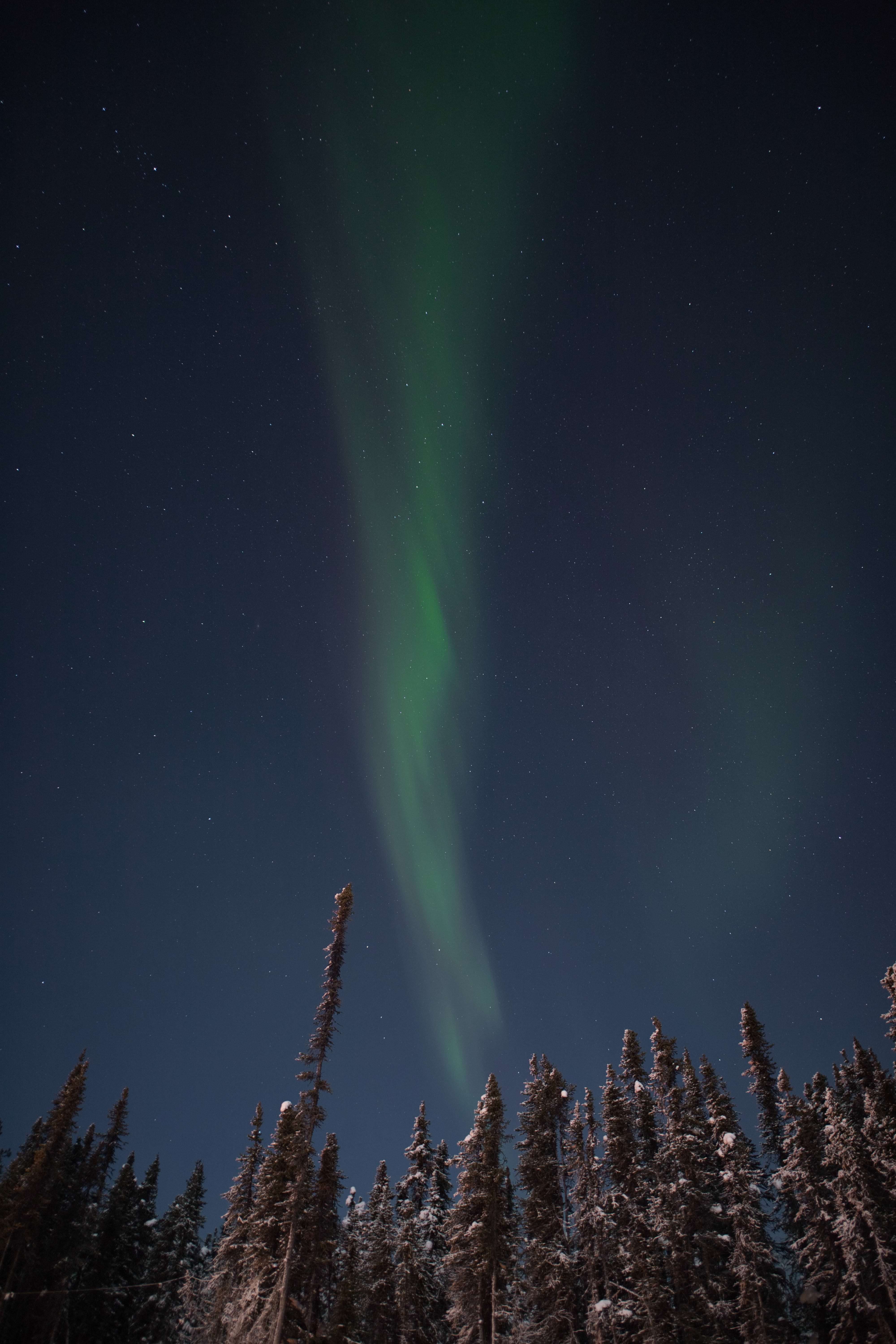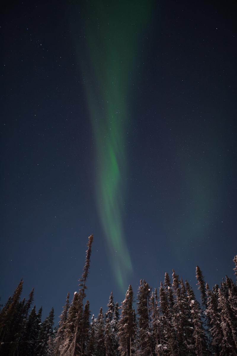 雪が積もった針葉樹林の上空にオーロラが広がる夜の写真素材です。緑色のオーロラが縦に伸び、無数の星が夜空全体に広がっている。冬の自然風景や北欧・極地をテーマにしたコンテンツにおすすめです。