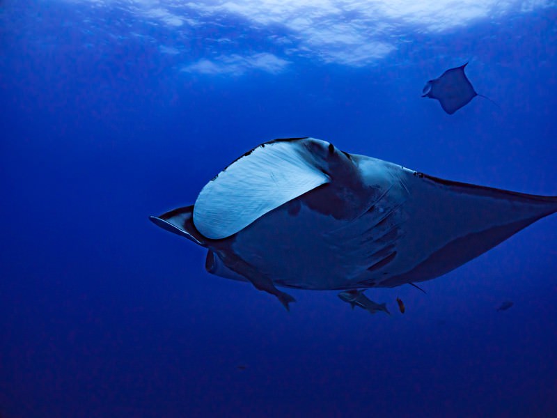 海中を泳ぐオニイトマキエイとコバンザメの写真素材です。口を開けたエイの体にコバンザメが付着し、上方から差し込む光の中を進んでいる。海洋生物や水中撮影をテーマにしたコンテンツ制作におすすめです。