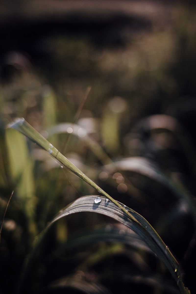 葉に付着した一つの水滴の写真素材です。細い茎の上に透き通った水滴が乗り、光の反射で白く煌き、朝露が宿る自然の瞬間を捉えています。背景には雨上がりの湿った葉が柔らかくぼけ、マクロ撮影や季節表現、ウェブデザイン素材などに活用できます。