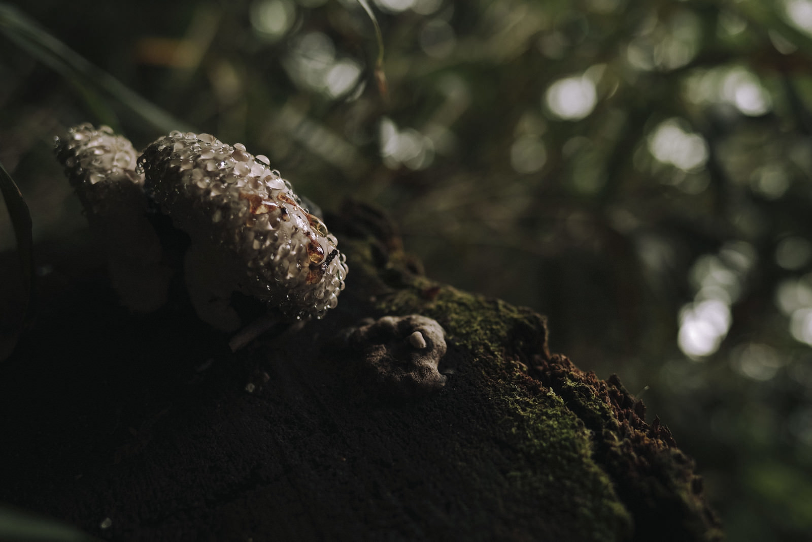 苔むした枝に生えたサルノコシカケの写真素材です。白っぽい傘状の菌体全体に水滴が付着し、雨や朝露による湿った環境を捉えています。ぼけた緑の背景が奥に広がる自然観察、きのこ図鑑、生物学的な教育コンテンツなどに最適です。