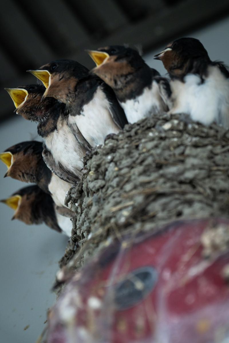 巣の中で口を開けているツバメの6羽の雛の写真素材です。枯れ草や泥で作られた巣に並んだ雛たちが黄色い口を大きく開け、明るい目をしており、それぞれ異なる角度で顔を向けています。野生動物や自然関連のコンテンツ、教育資材、春夏の季節素材などに活用できます。
