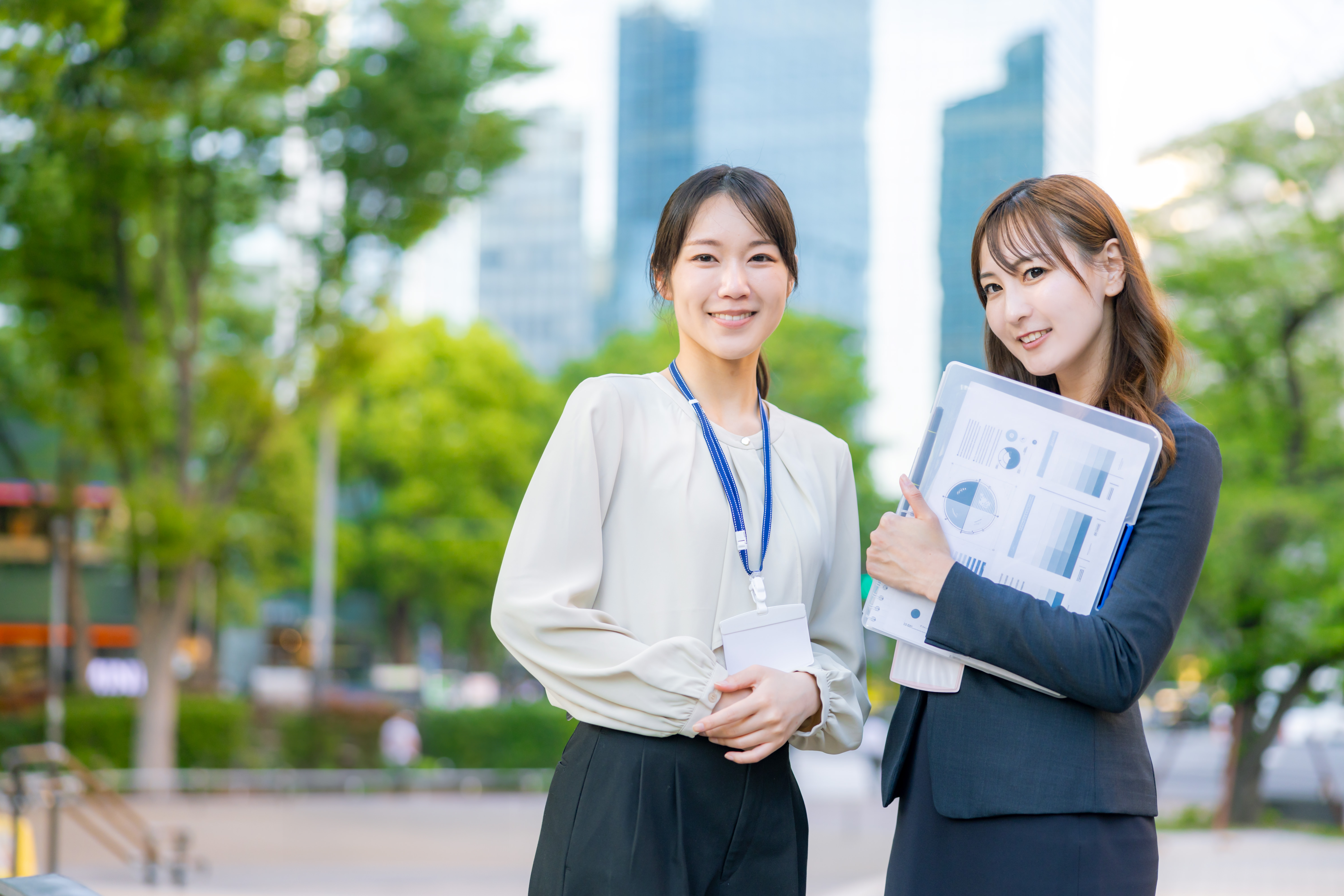 都市ビルを背景にした若いOLの写真素材です。白と紺のビジネスカジュアルを着た女性が、緑に囲まれた屋外で資料を持ち笑顔を見せています。都会のビル街での爽やかなビジネスシーンを表現しており、企業PR素材やビジネス関連の記事、OL向けコンテンツにおすすめです。