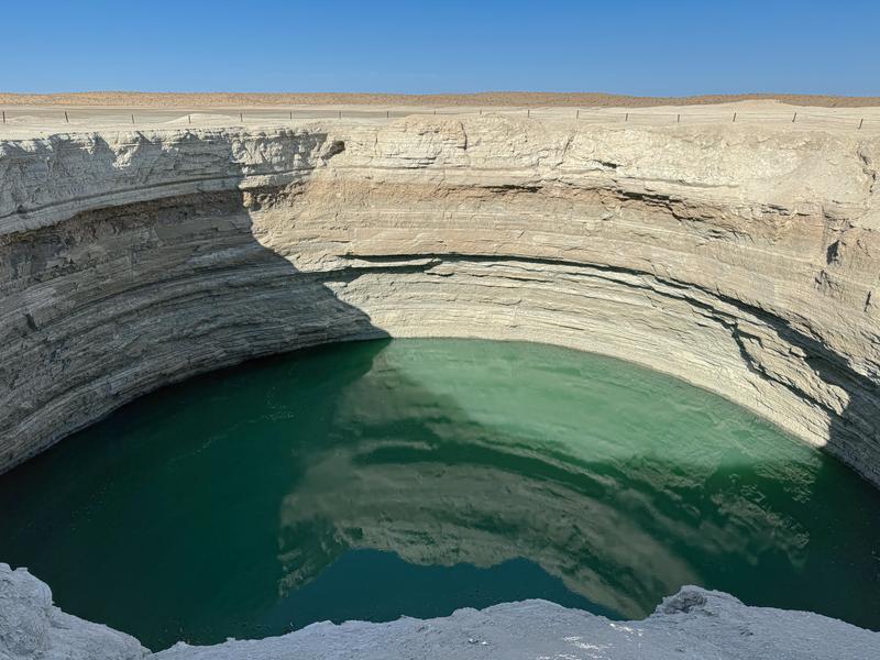 トルクメニスタンの地獄の門と呼ばれる大きなクレーターの写真素材です。白い石灰岩の崖が円形に削られ、底部には緑色に濁った水が溜まり、崖の側面には地質年代を示す層状の岩が露出しています。地理学習や地質現象、自然災害関連のコンテンツなどにおすすめです。