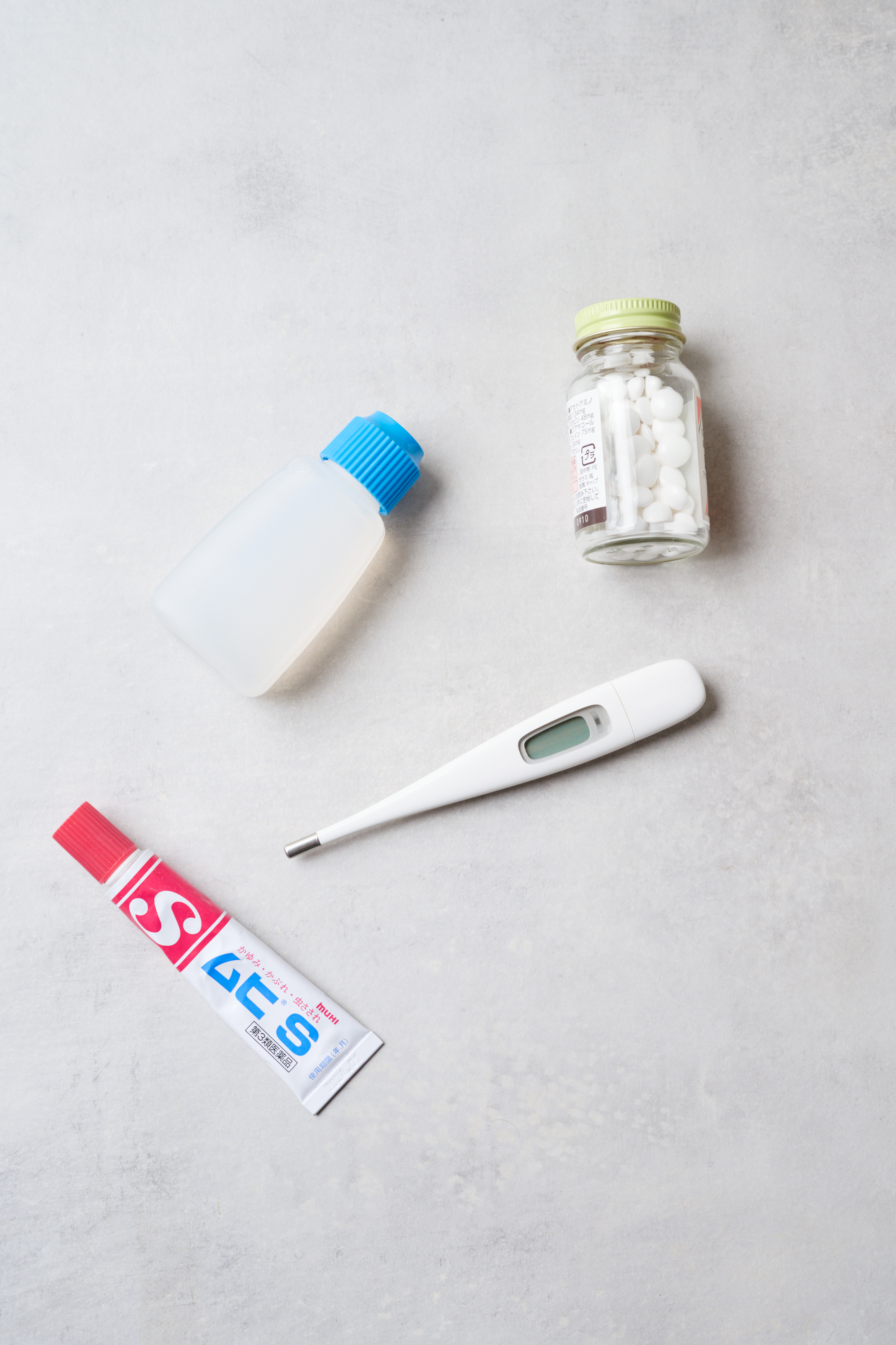 体温計と常備薬をセットにした医療用品の写真素材です。青いキャップのついた白いボトルの液体薬、白いデジタル体温計、ピンク色のチューブ薬、黄緑色の蓋の瓶に入った白い錠剤が配置されています。家庭での健康管理や医療関連のコンテンツ、医薬品紹介などにおすすめです。