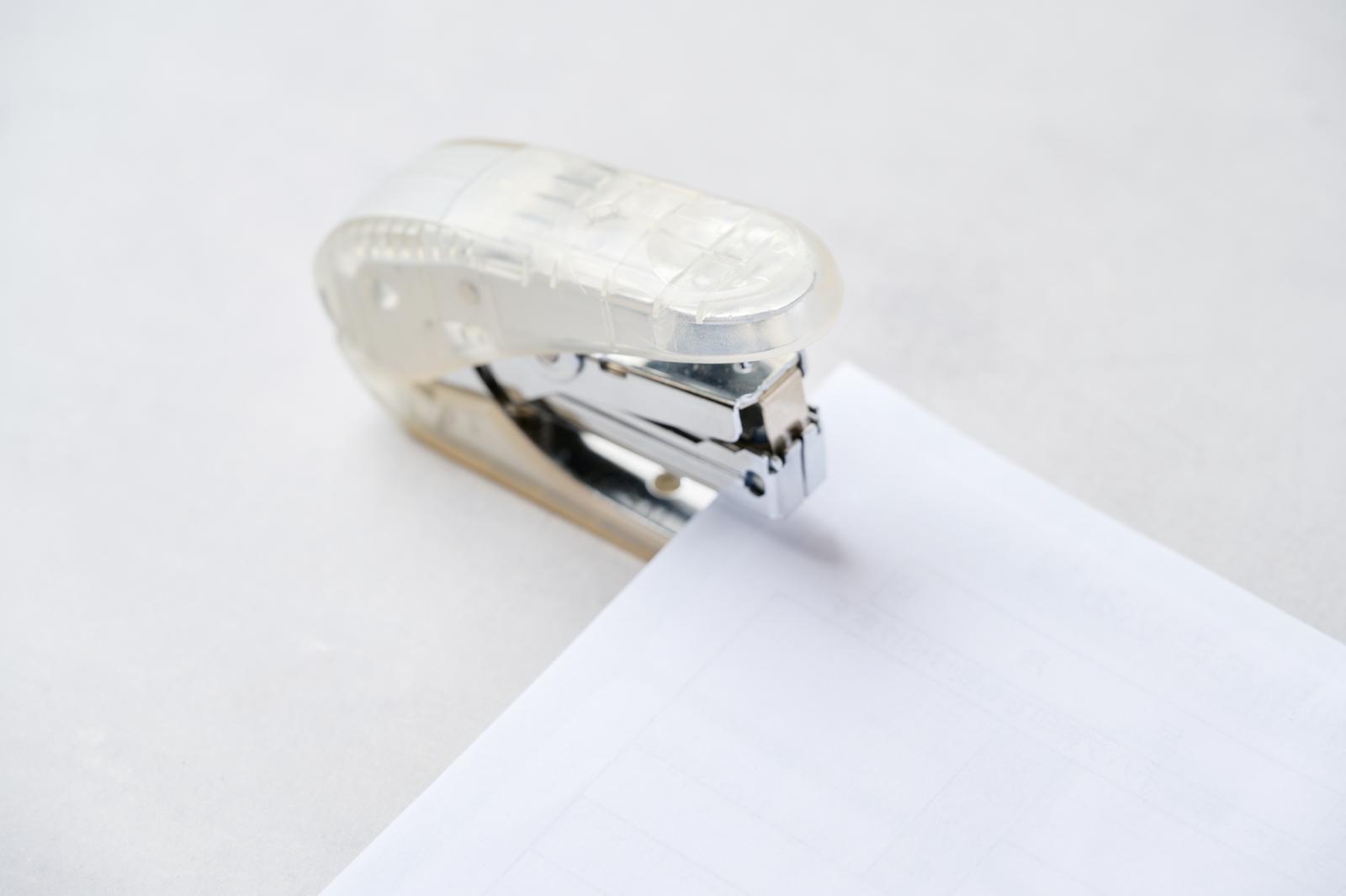 透明なボディの金属製ホッチキスで白い用紙を留めている写真素材です。透明な樹脂製のボディに金属製の留め具が搭載されたホッチキスが、白い用紙の端を留めており、留め金具の内部の金属部分が見えています。オフィス用品の紹介やビジネス関連素材、事務作業のイメージ画像などにおすすめです。