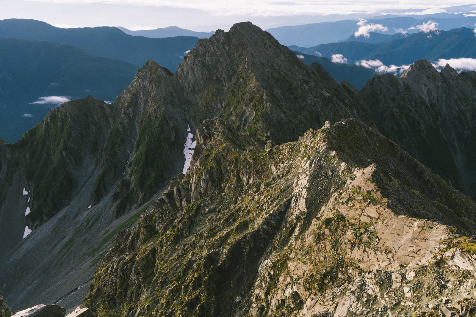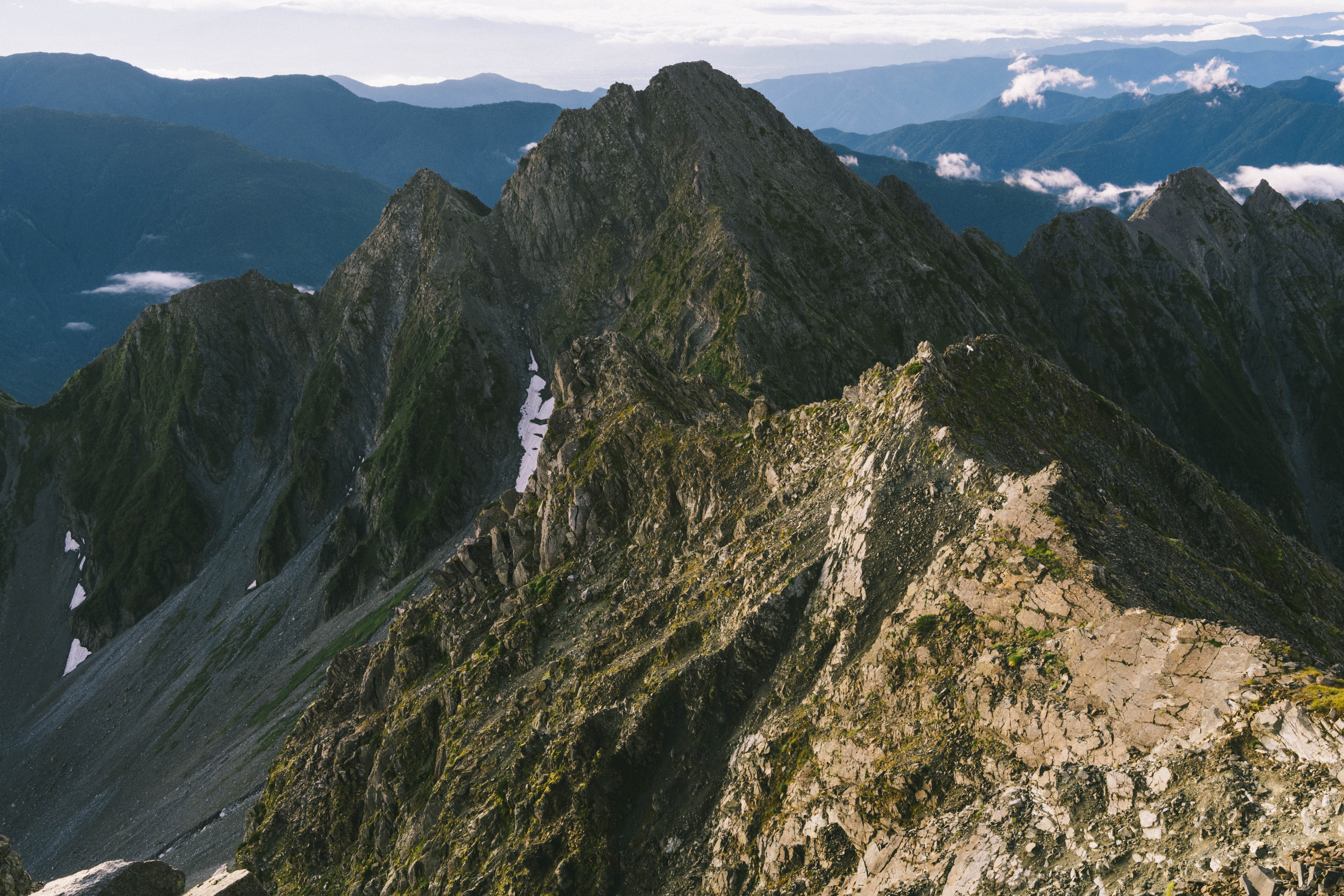 稜線上の高所から見た前穂高岳と奥穂高岳の峰々を撮影した写真素材です。灰色の岩峰が連なるナイフリッジ状の尾根には部分的に草が生え、斜面に白い残雪が残っている。登山やトレッキング関連のコンテンツ、自然風景のデザイン素材などにおすすめです。