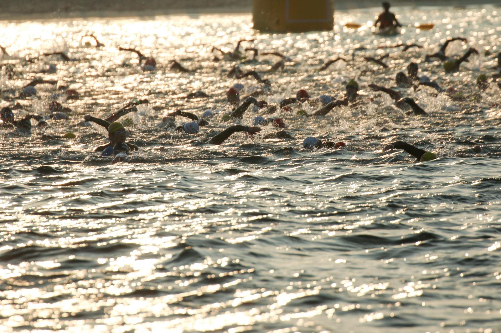 オープンウォータースイムで競泳するトライアスロン選手の写真素材です。複数の選手が逆光の水面を泳ぎ、日光が水しぶきに反射して輝き、背景の桟橋に観客も見えています。スポーツ関連のコンテンツやトライアスロン競技の紹介、健康・フィットネス系のメディア素材などにおすすめです。