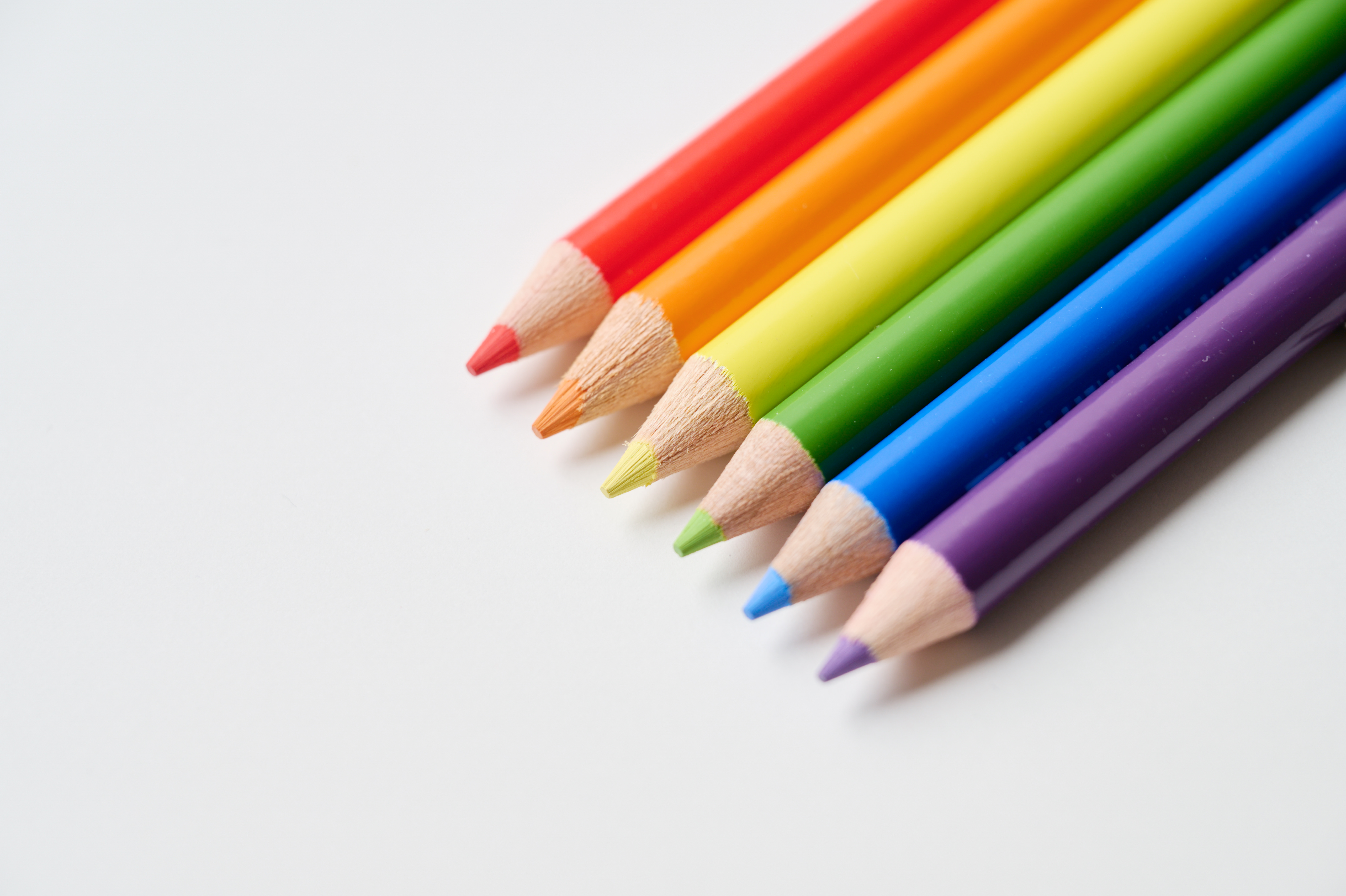 虹色に並んだ色鉛筆の写真素材です。赤、橙、黄、緑、青、紫の6色が斜めに配置され、削られた先端から各色が露出しており、白い背景に細い影が落ちています。子ども向けコンテンツ、文具紹介、デザイン素材やイラスト制作の記事などにおすすめです。