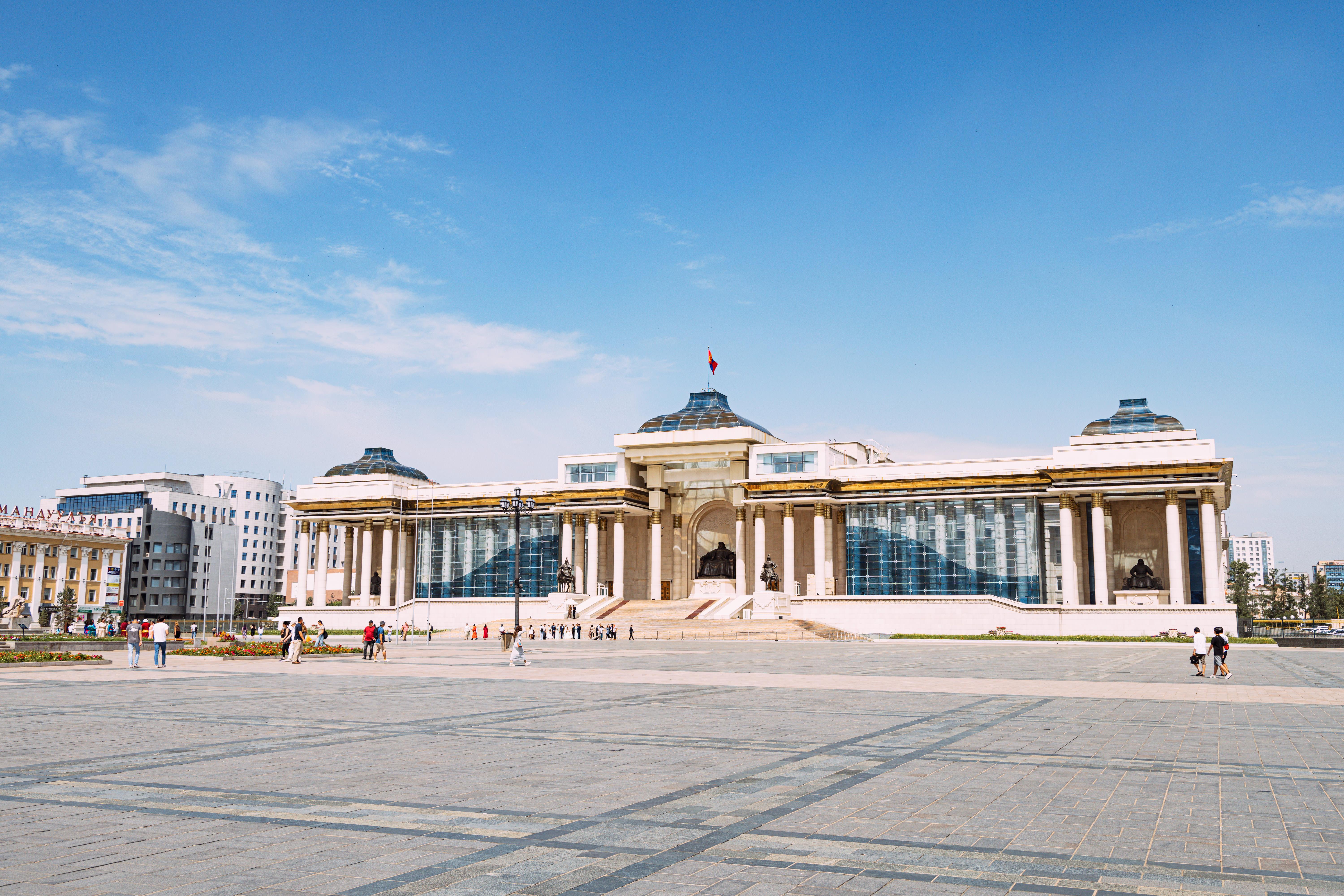 モンゴルの首都ウランバートルにあるスフバートル広場と宮殿の写真素材です。白い建物の正面に黄金色の装飾が施され、複数のドーム屋根が頂上に立ち、赤い旗が掲げられており、広大な広場には多くの人が散在しています。歴史的建造物や観光地の紹介、モンゴル関連のコンテンツ、建築や都市景観などにおすすめです。