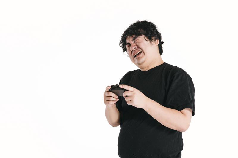 ゲームコントローラーを握って失敗に思わず顔を歪める男性ゲーマーのフリー写真素材