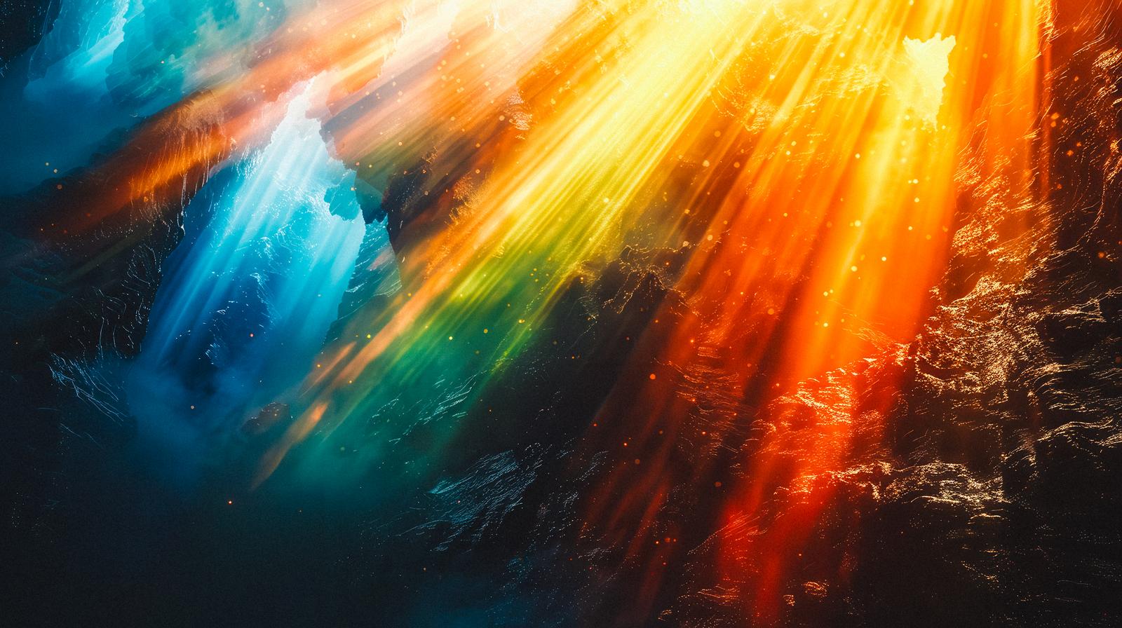 AIで生成した水中の岩壁に光が差し込む画像素材です。左側から青白い光線が降り注ぎ、中央から右側へかけてオレンジ・黄色・赤へと色が変化する光の帯が斜め下に流れ、岩肌を照らす海中シーンです。水中やファンタジー背景に活用できます。