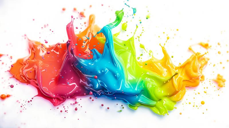 AIで生成したカラフルなペンキが波状に混ざりあう画像素材です。赤やピンク、オレンジ、青、黄緑、黄色のペンキが流動的に交わり合い、しぶきや粒子が白い背景に散らばっています。広告やポスター、アート作品、デザインのビジュアル素材として活用できます。