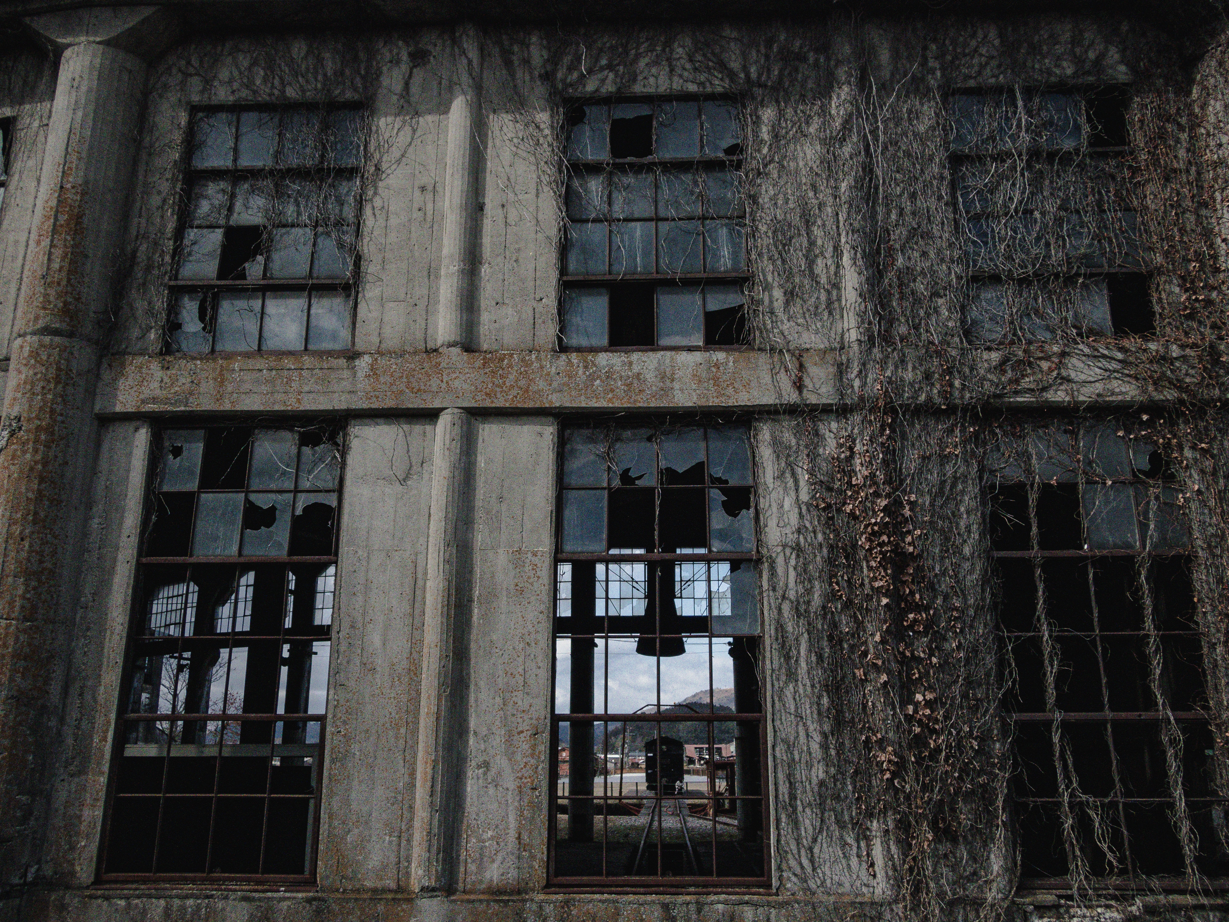 豊後森扇形機関庫の朽ち果てた窓の写真素材です。コンクリート製の壁面に複数の大型窓が配置され、一部の窓ガラスは割れ、蔦が壁面を覆う様子が見えます。大分県に現存する鉄道遺産として、産業遺産や歴史的建造物、廃墟の雰囲気を伝えるコンテンツ制作におすすめです。
