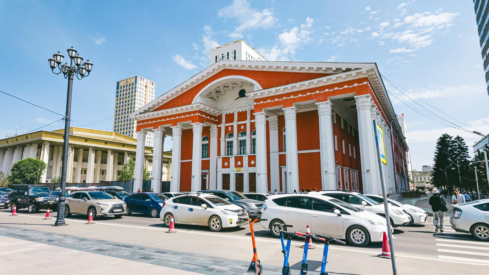 ウランバートルの国立オペラ・バレエ劇場前の駐車場に渋滞する車両の写真素材です。オレンジ色と白色のクラシカルな劇場の前には複数の乗用車が駐車あるいは駐車待ちの状態で並び、周囲にはベージュ色の政府庁舎などの建物が立ち並んでいます。モンゴルの首都の都市風景や交通風景、観光関連のコンテンツなどにおすすめです。