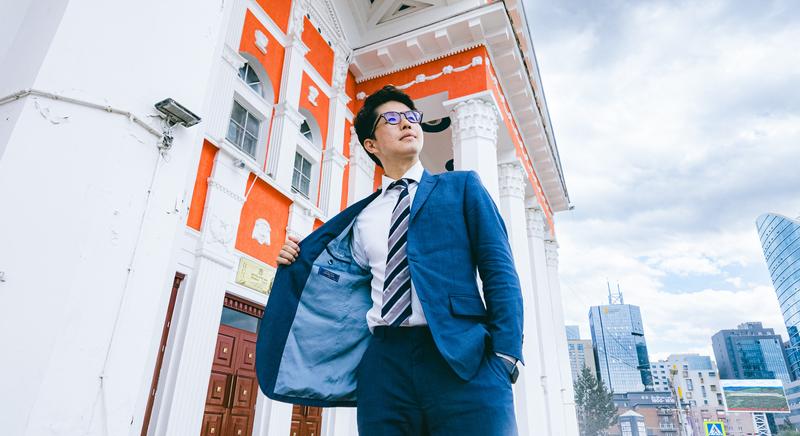 DANKANのオーダースーツを着たビジネスマンの写真素材です。紺色のジャケットに白いシャツと紺色のネクタイを合わせ、眼鏡をかけた男性がビルの前で上を見上げています、背後には白と橙色の建築物が広がり、モンゴルの都市風景が映り込んでいます。ビジネス関連のコンテンツ制作や企業紹介、出張・旅に関するコンテンツなどにおすすめです。