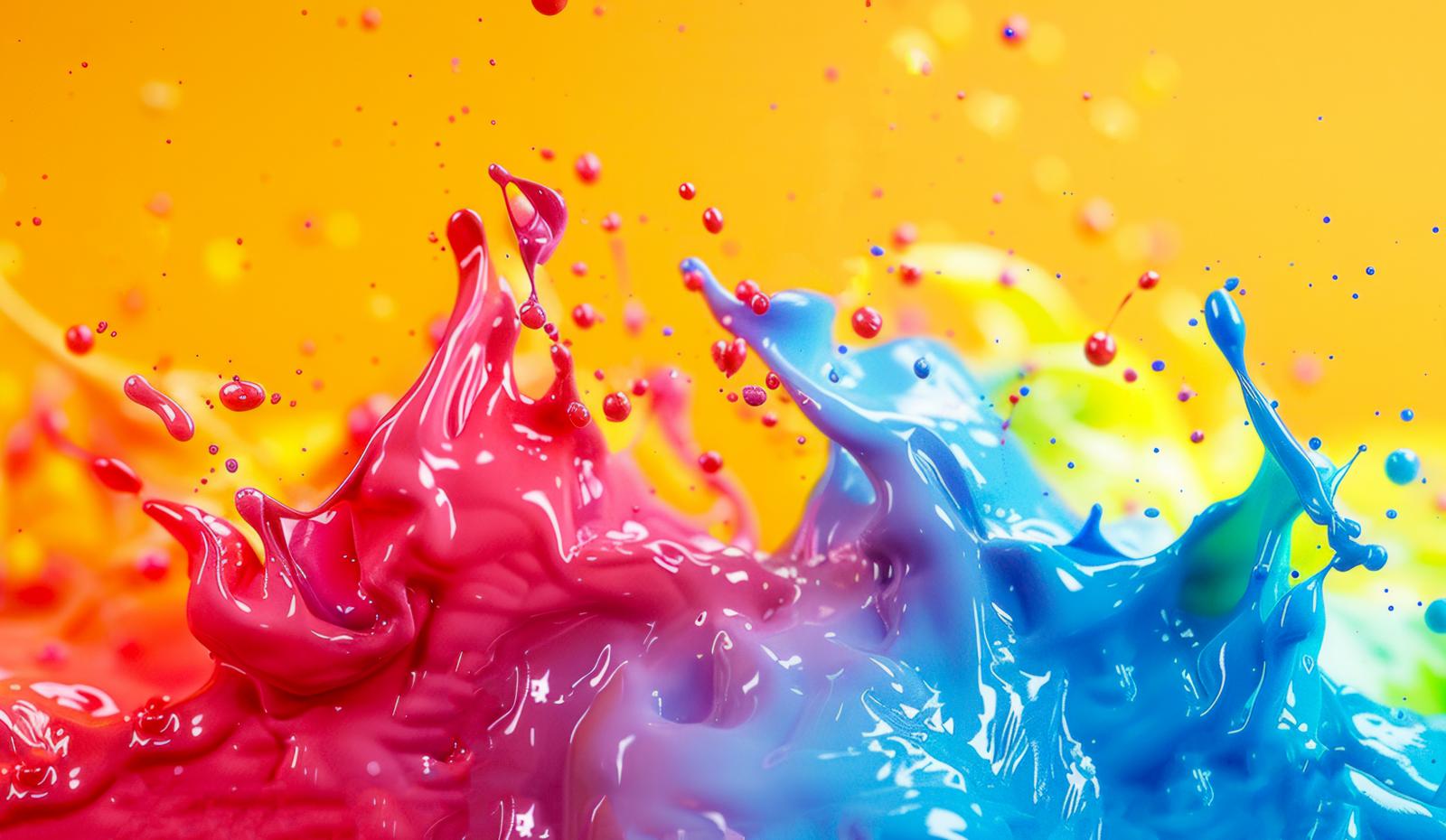 黄色背景で赤からピンク、紫、青に変化する塗料が飛び散る抽象的な混色