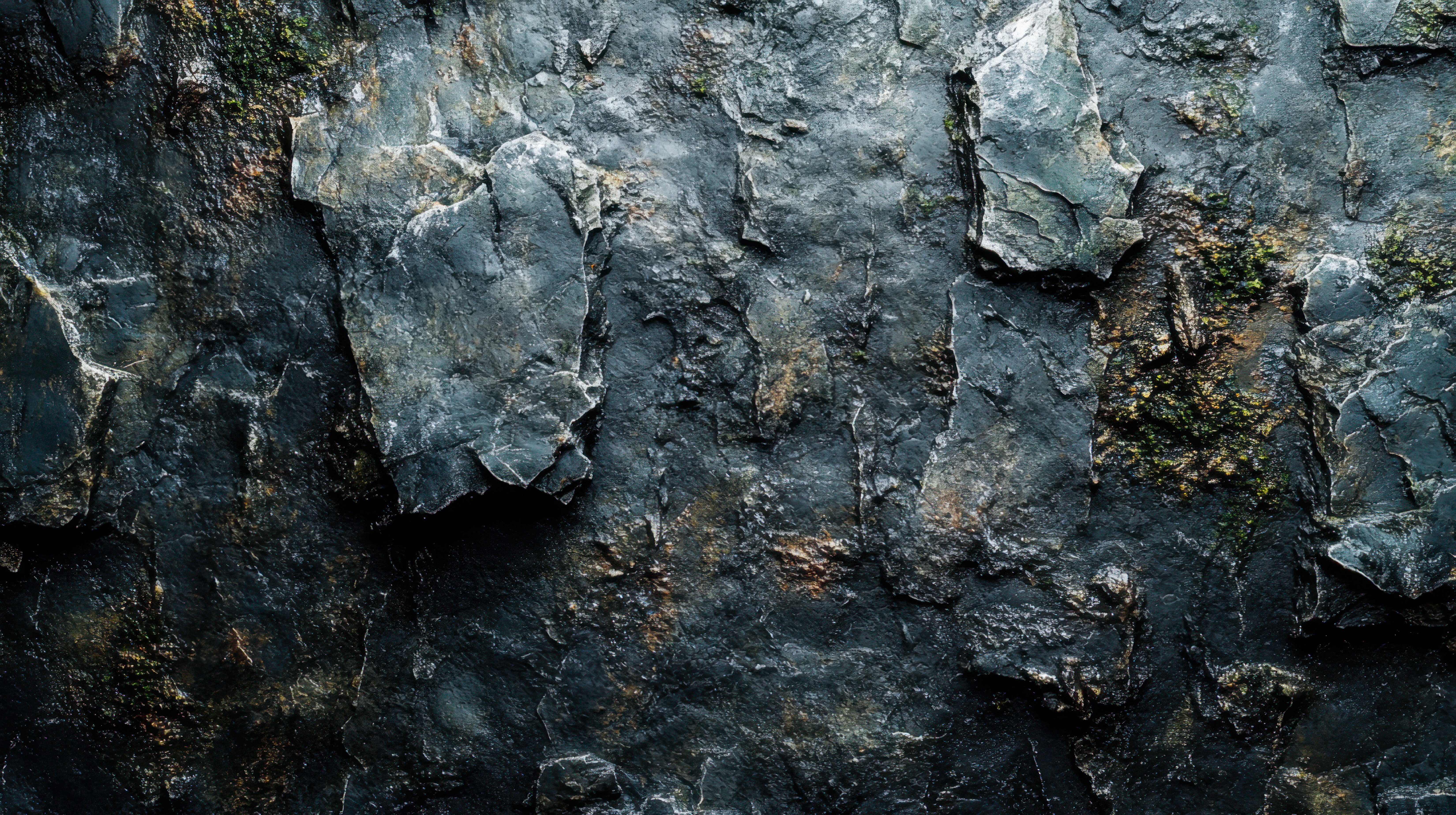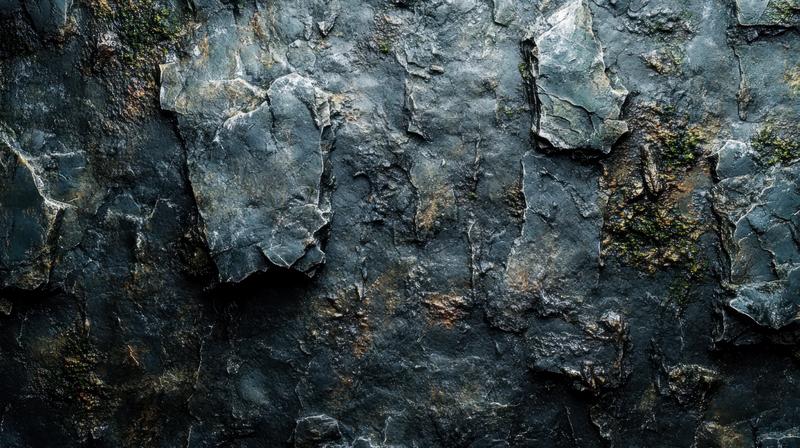AIで生成した風化した岩肌のテクスチャー画像素材です。暗いグレーを基調とした石壁には亀裂が多数走り、黄褐色の変色や黒い苔が付着しており、自然な凹凸感が立体的に再現されています。デザイン背景やゲーム素材、建築イメージ表現などに活用できます。