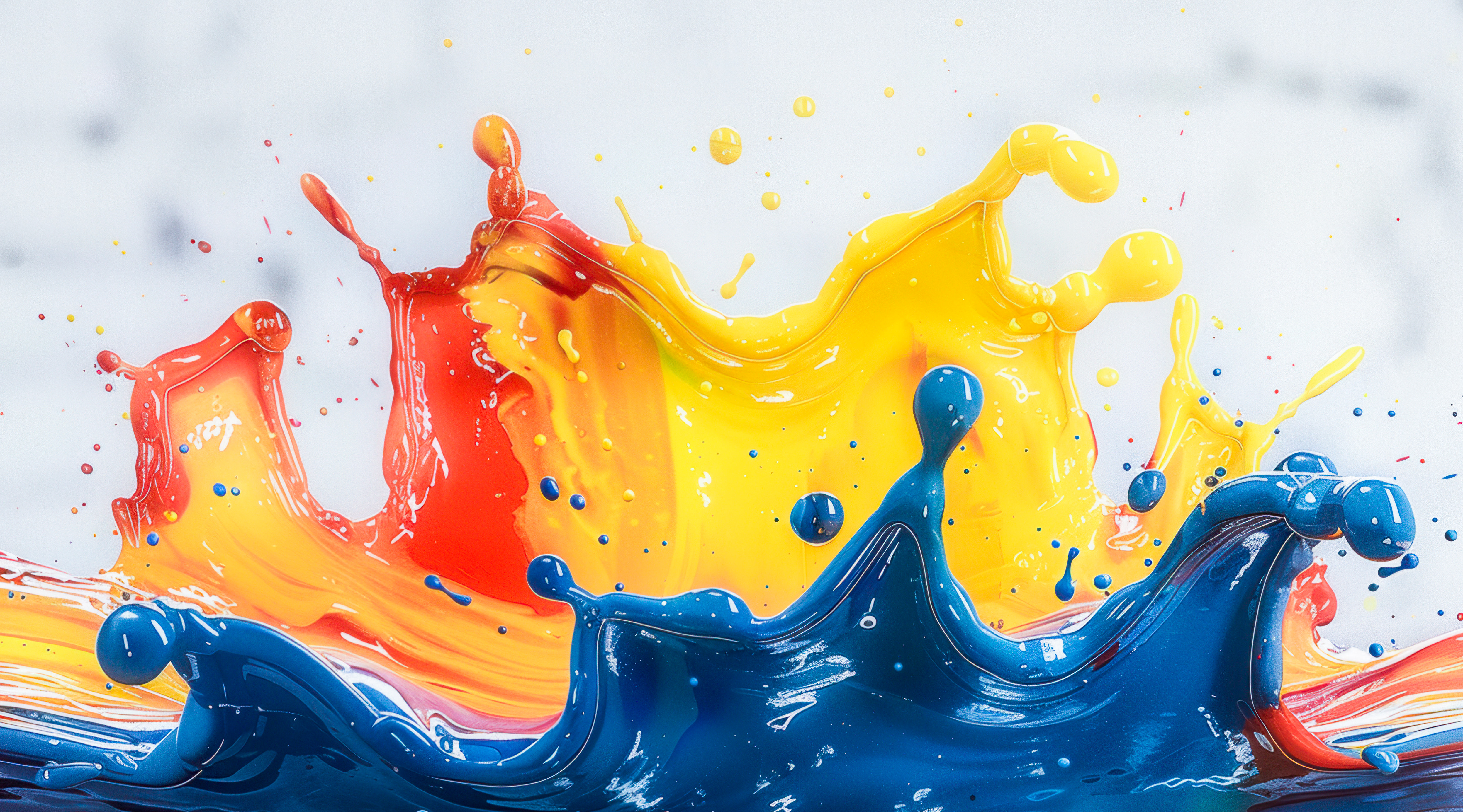 赤・黄・青の塗料が波状に混ざり合い、液体の粒が飛び散る様子