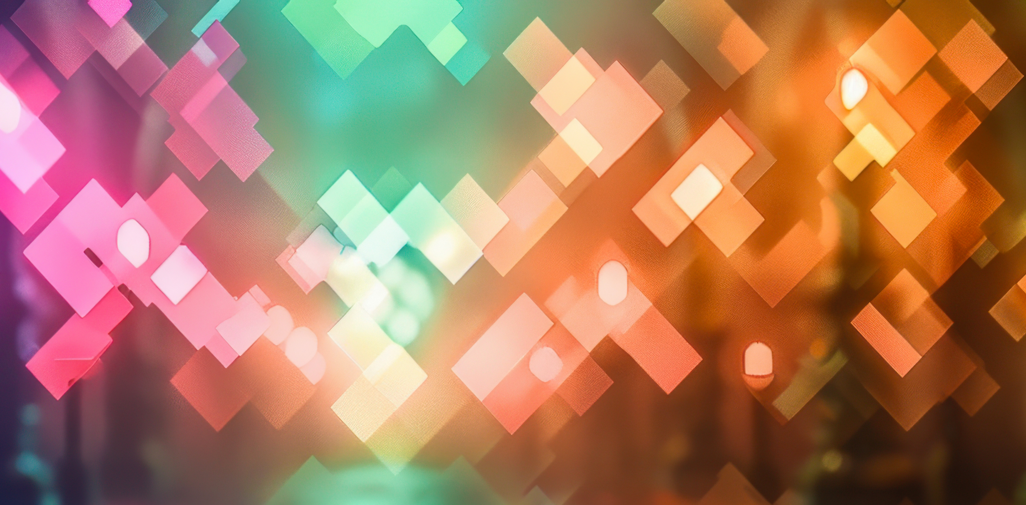 カラフルな四角形のモザイク光が浮かぶグラデーションデザインのAI画像素材(フリー)