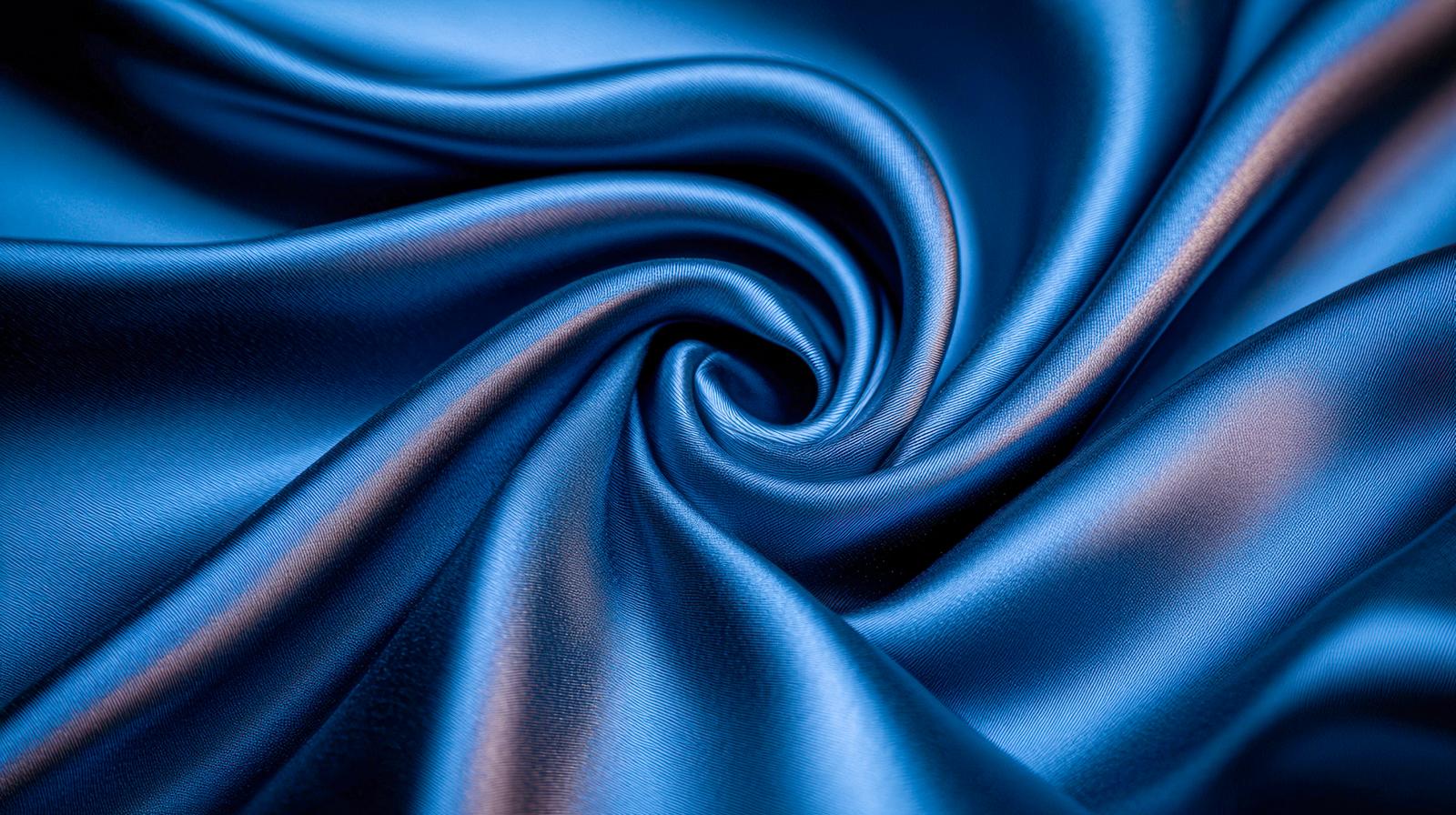AIで生成した光沢のあるサテン生地の画像素材です。青系の深い色合いの布が渦巻き状に折り重なり、光と影が複雑な陰影を作り出す高級感のあるテクスチャーです。衣装製作やテキスタイルデザイン、ファッション関連のコンテンツに活用できます。