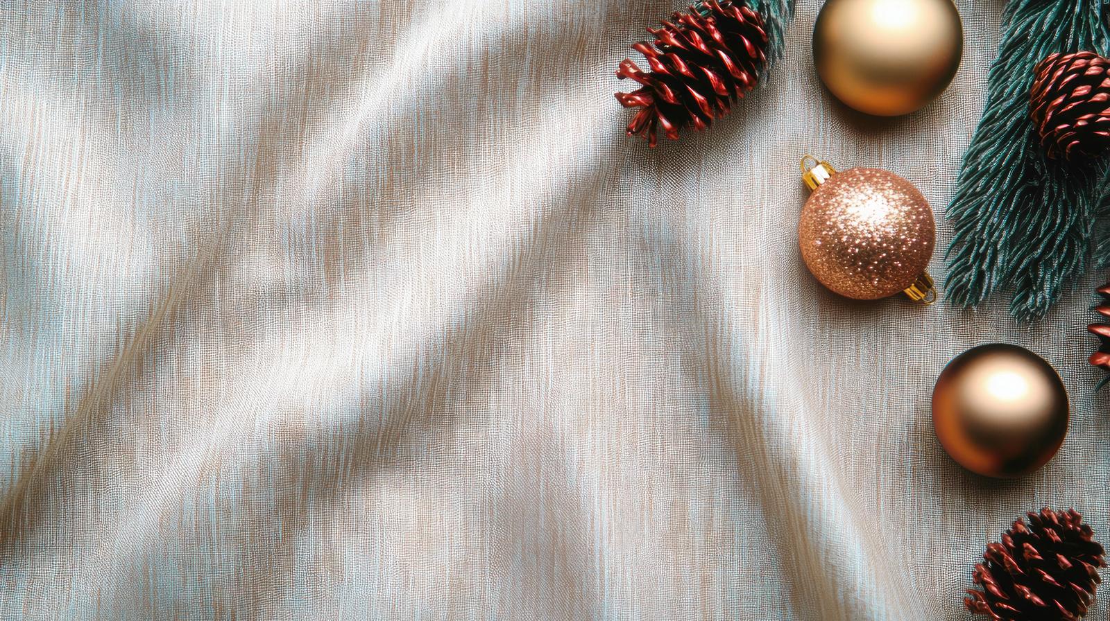 AIで生成したシルク布とクリスマスオーナメントの画像素材です。白地のシルク生地の上に赤い松ぼっくり、金色と銅色のボール、グリーンの枝が配置され、光が布の質感に反射しています。ホリデーシーズンのデザインやクリスマスのテーブルコーディネート、装飾背景として活用できます。