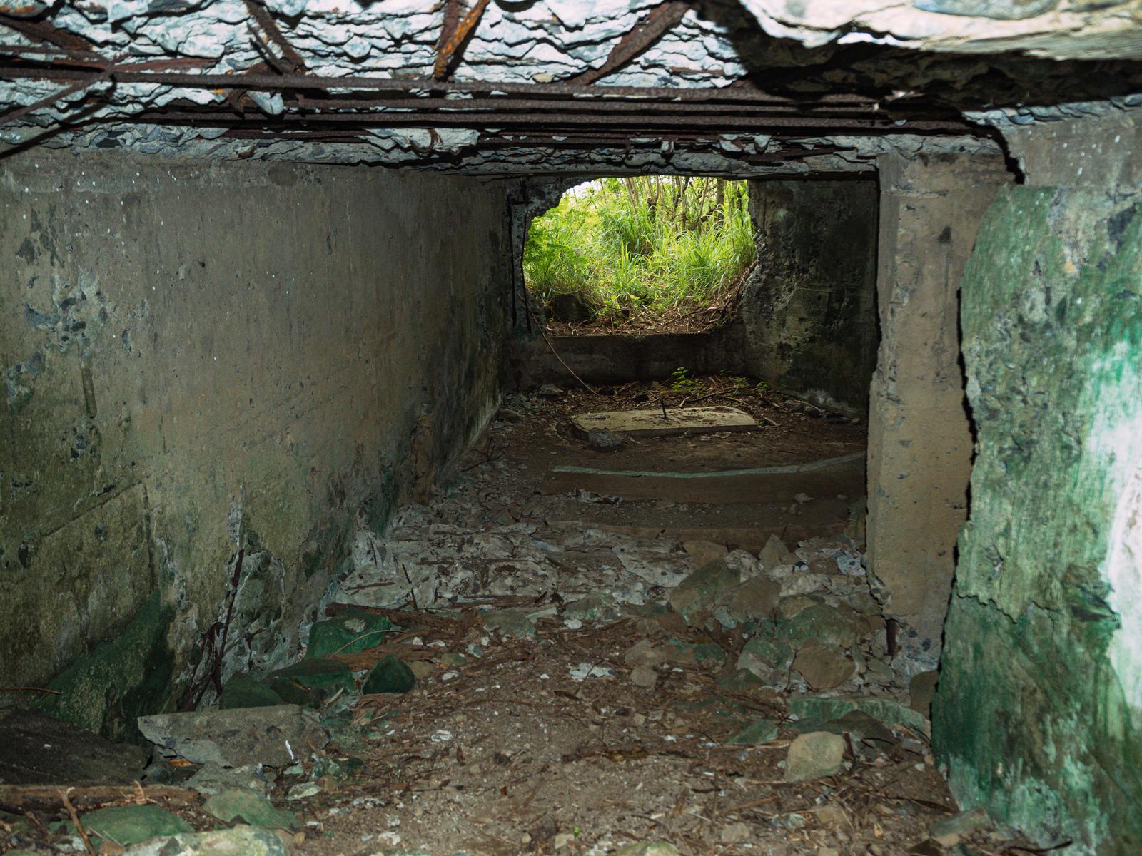 硫黄島の陸軍野砲陣地トーチカ内部の写真素材です。コンクリート製の壁面には苔が繁殖し、天井の木製梁は劣化して黒ずみ、床には瓦礫と土が堆積し、奥方には開口部から外部の草が見えています。戦争遺跡や歴史関連、ドキュメンタリー制作などにおすすめです。