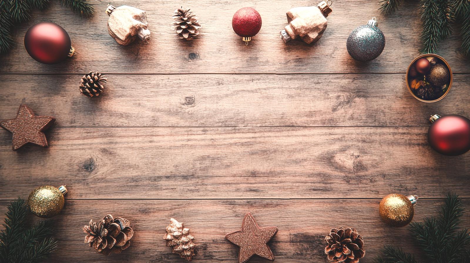 木製テーブルに並ぶクリスマスオーナメントと松ぼっくりの装飾のAI画像素材(フリー)