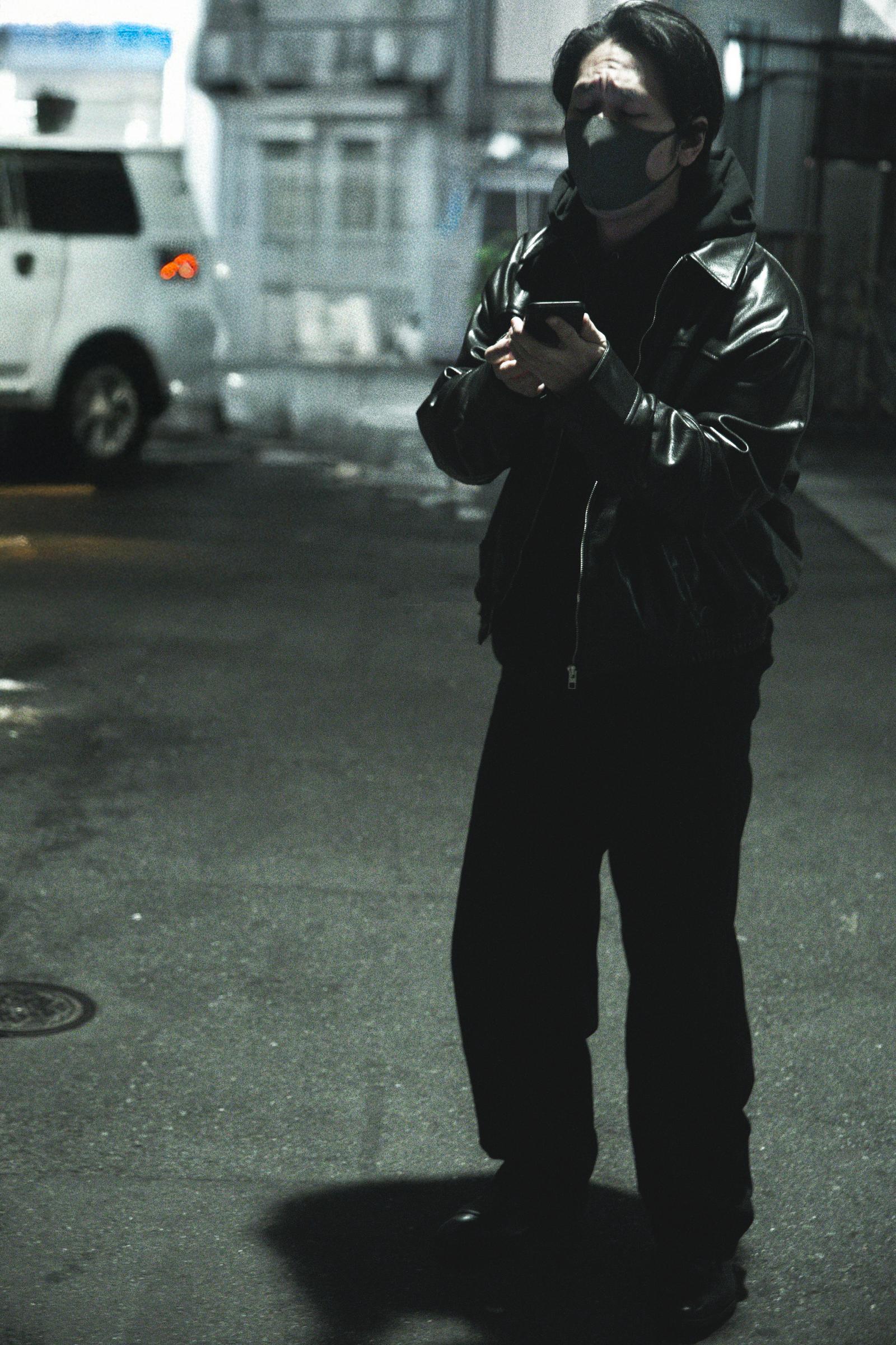 夜の街を歩く男性の写真素材です。黒いジャケットとマスク姿で薄暗い路地に立ち、スマートフォンを操作しながら周囲を警戒する男性、背景に白いワゴン車と建物が写っています。犯罪予防啓発やSNS詐欺関連の記事、防犯コンテンツなどにおすすめです。