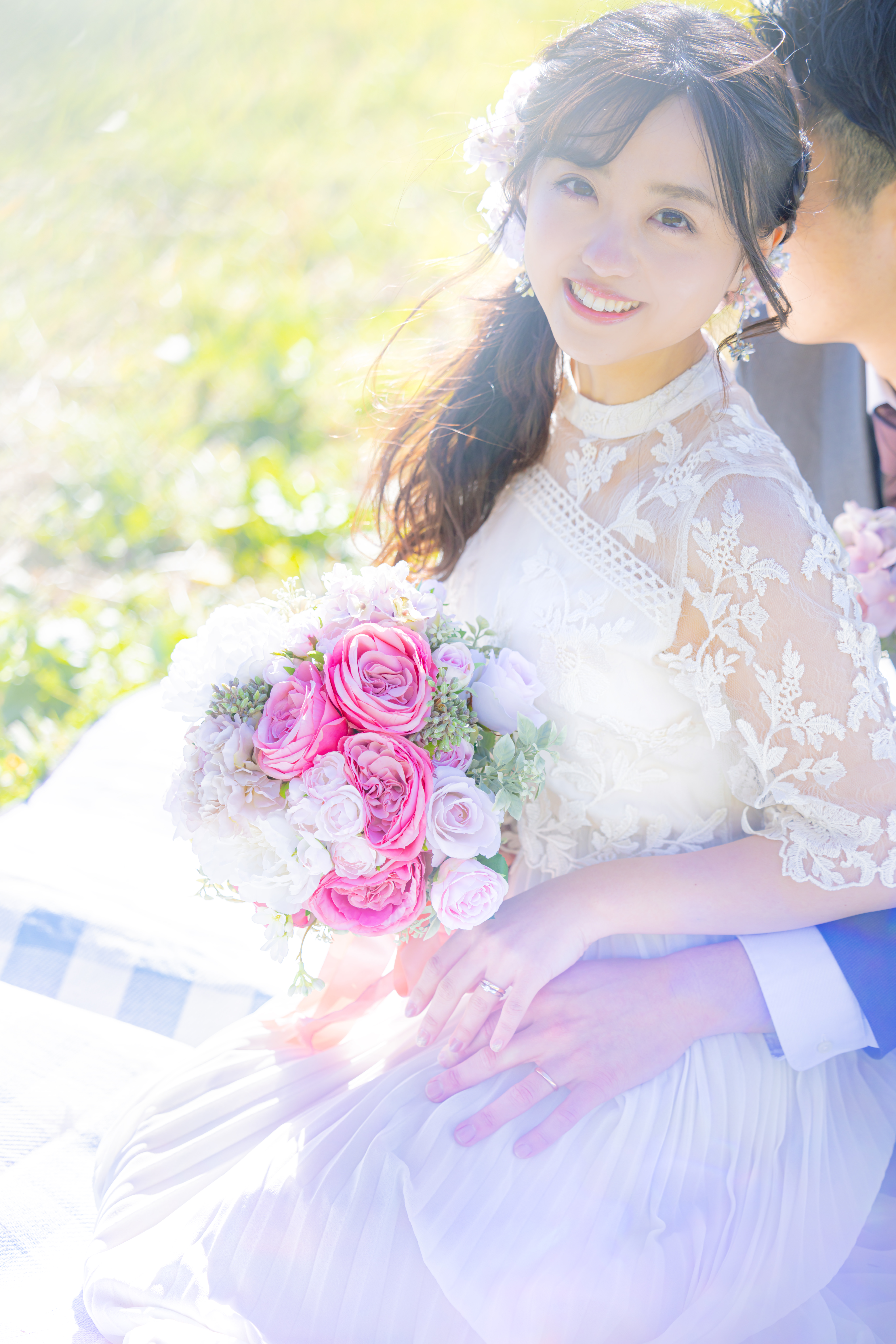 ブライダルドレスを着た花嫁の写真素材です。白いレースのウェディングドレスを身につけた女性が、ピンク色のバラが中心のブーケを両手で持ち、後ろから男性に寄り添われながら笑顔で前を向いています。結婚式やウェディング関連、ブライダル企画やラブストーリーのコンテンツなどにおすすめです。