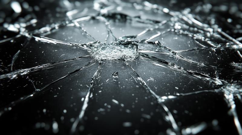 黒いガラスの中央から放射状に広がるひび割れとクラック