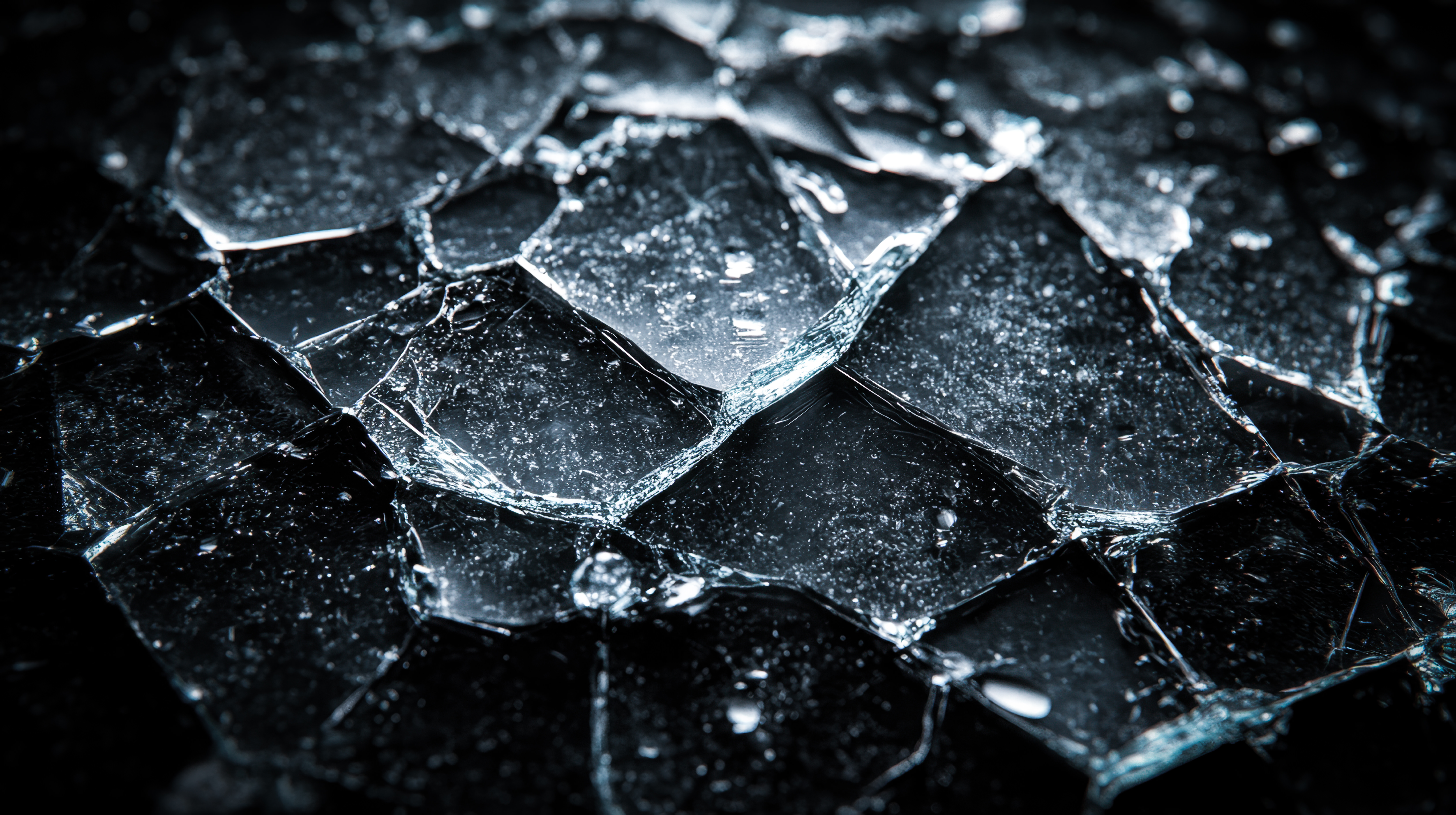 AIで生成した割れたガラスのクローズアップ画像素材です。暗い背景の上に破片が広がり、断面が白く光る部分もある。破壊・危険をテーマにしたコンテンツやクール系のデザイン背景にどうぞ。
