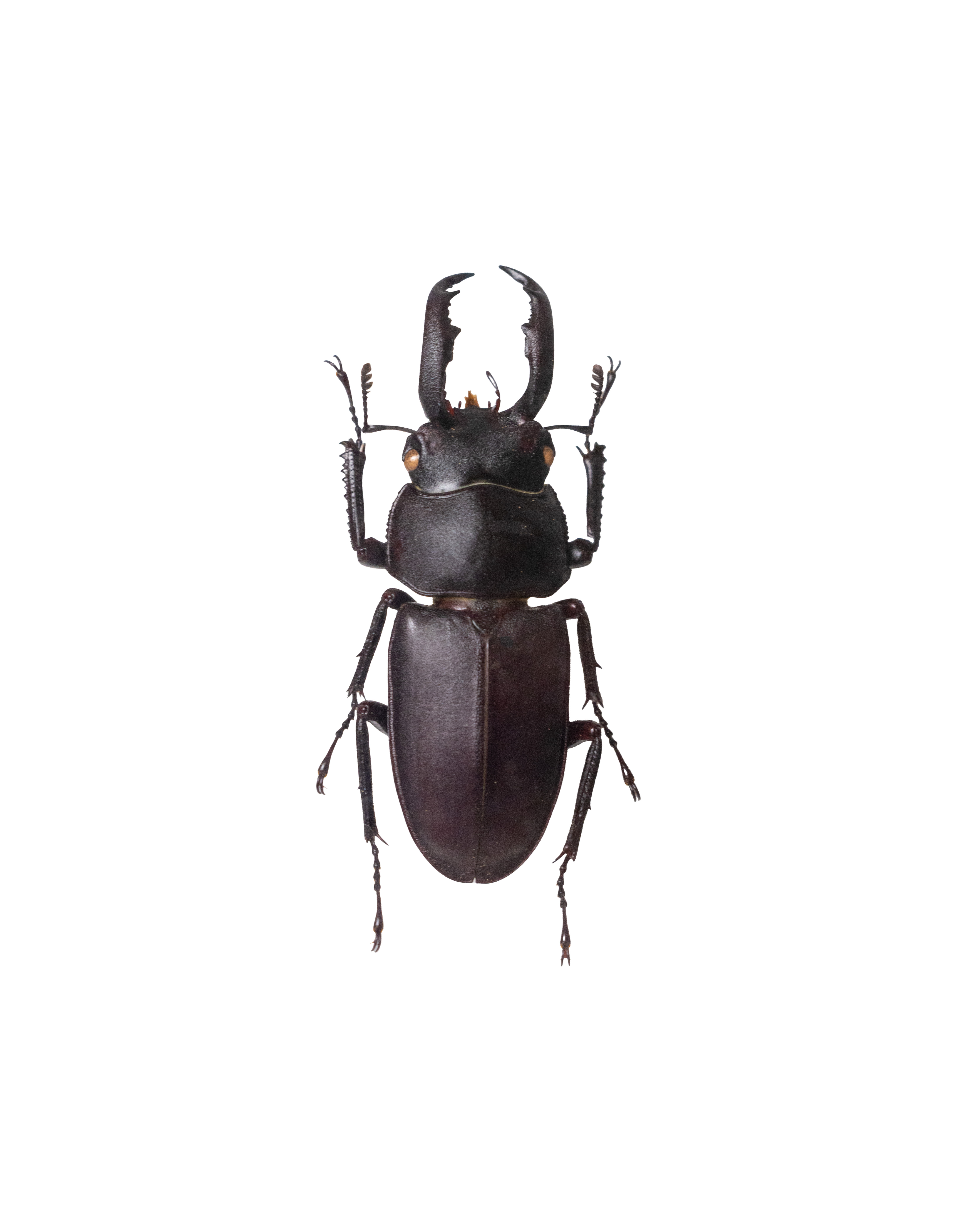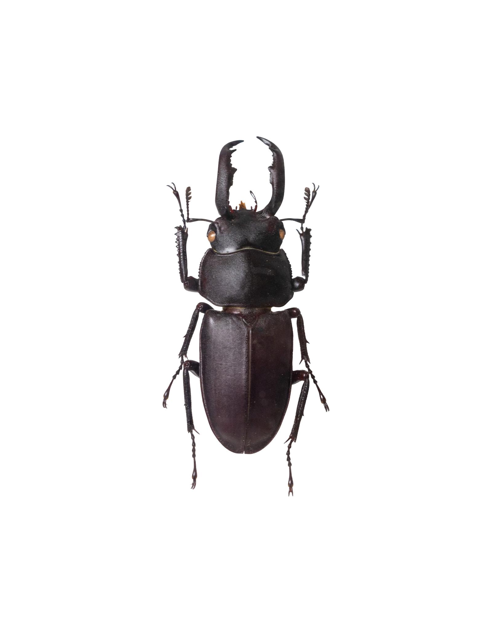 ミヤマシカクワガタの標本の写真素材です。黒色の光沢ある体に大きく湾曲した大顎を持ち、触覚と6本の脚を備えており、頭部には褐色の複眼が確認できます。自然観察教材、昆虫図鑑、生物学習コンテンツ、デザイン素材などに活用できます。